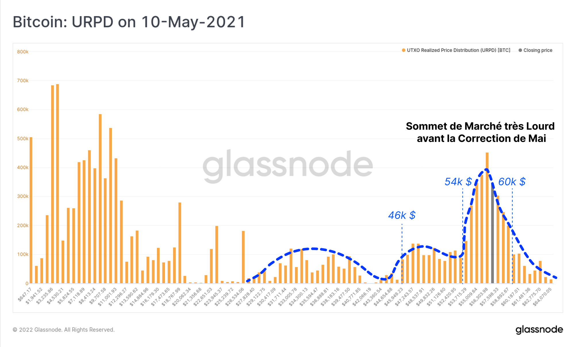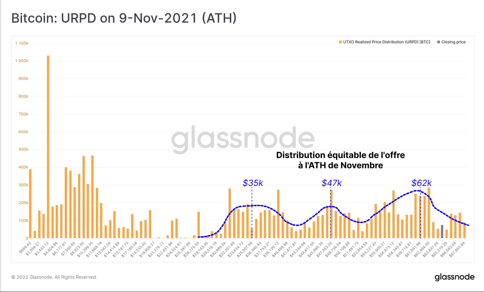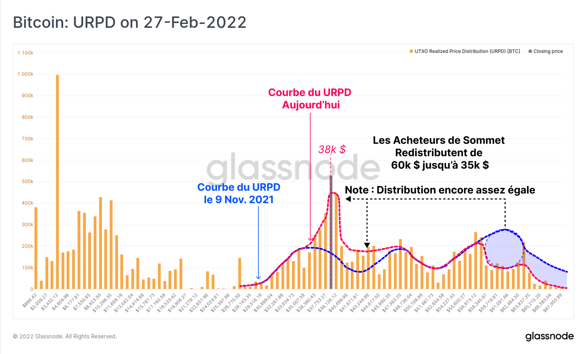En ce qui concerne la correction actuelle, nous pouvons constater qu'une distribution remarquablement régulière de l'offre de jetons a été établie, de la hausse de juillet 2021 jusqu'à l'ATH de novembre. Cette distribution indique ce qui suit :