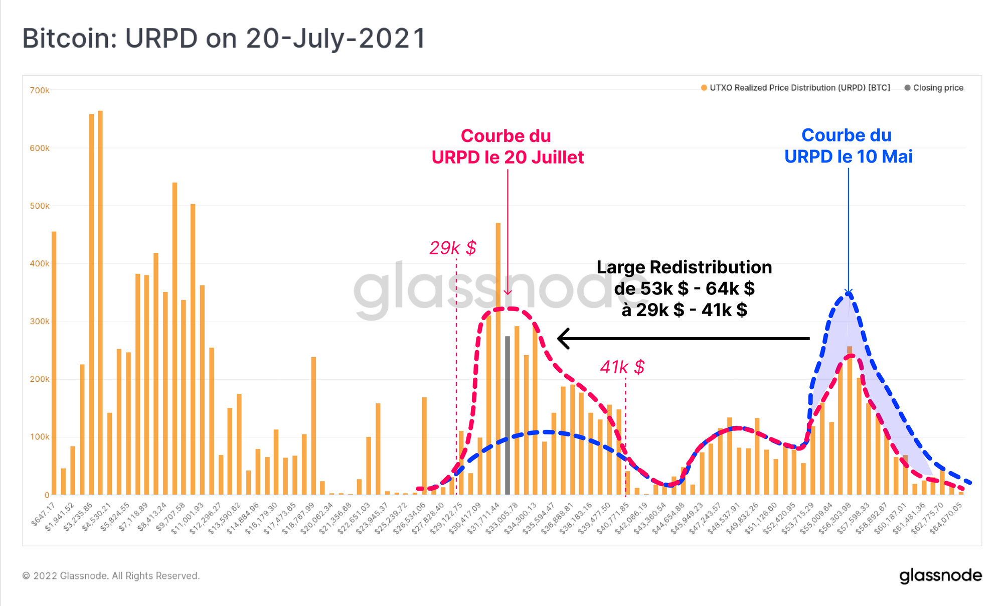 Commencons cette analyse par un examen approfondi de la métrique URPD, qui détaille la distribution de l'offre de jetons en fonction du prix de leur dernier mouvement sur la chaîne. Ce que nous souhaitons explorer ici, ce sont les similitudes et les différences entre le comportement des investisseurs au cours de la présente correction et de celle de mai-juillet 2021.