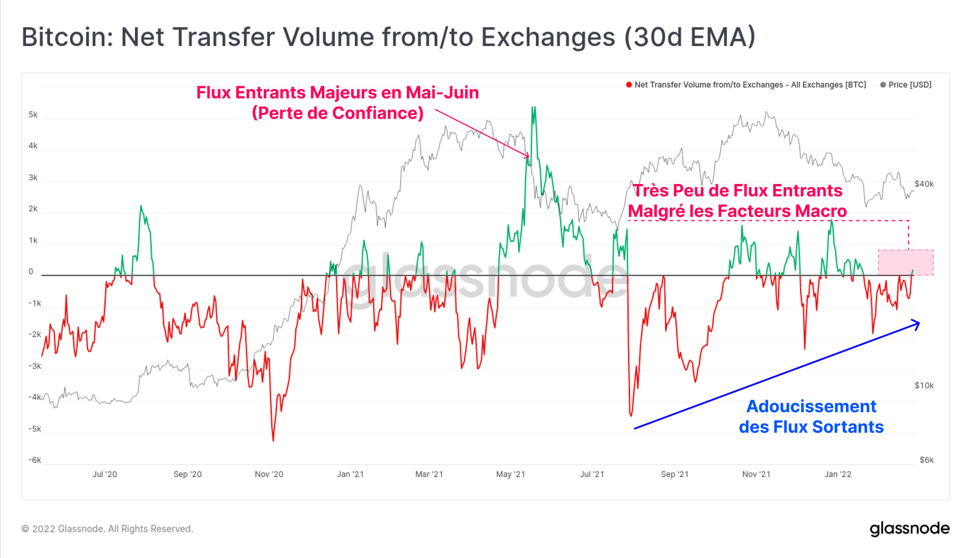 Le graphique ci-dessous montre une moyenne mobile exponentielle sur 30 jours des flux nets des écahnges et nous pouvons constater que depuis juillet, le marché a favorisé les retraits de jetons (en rouge, les sorties). La tendance des flux sortants s'est adoucie au cours de cette période, mais nous n'avons toujours pas vu de flux entrants similaires à ceux enregistrés entre mai et juillet de l'année dernière, même avec tous les vents contraires macroéconomiques qui sont en jeu.
