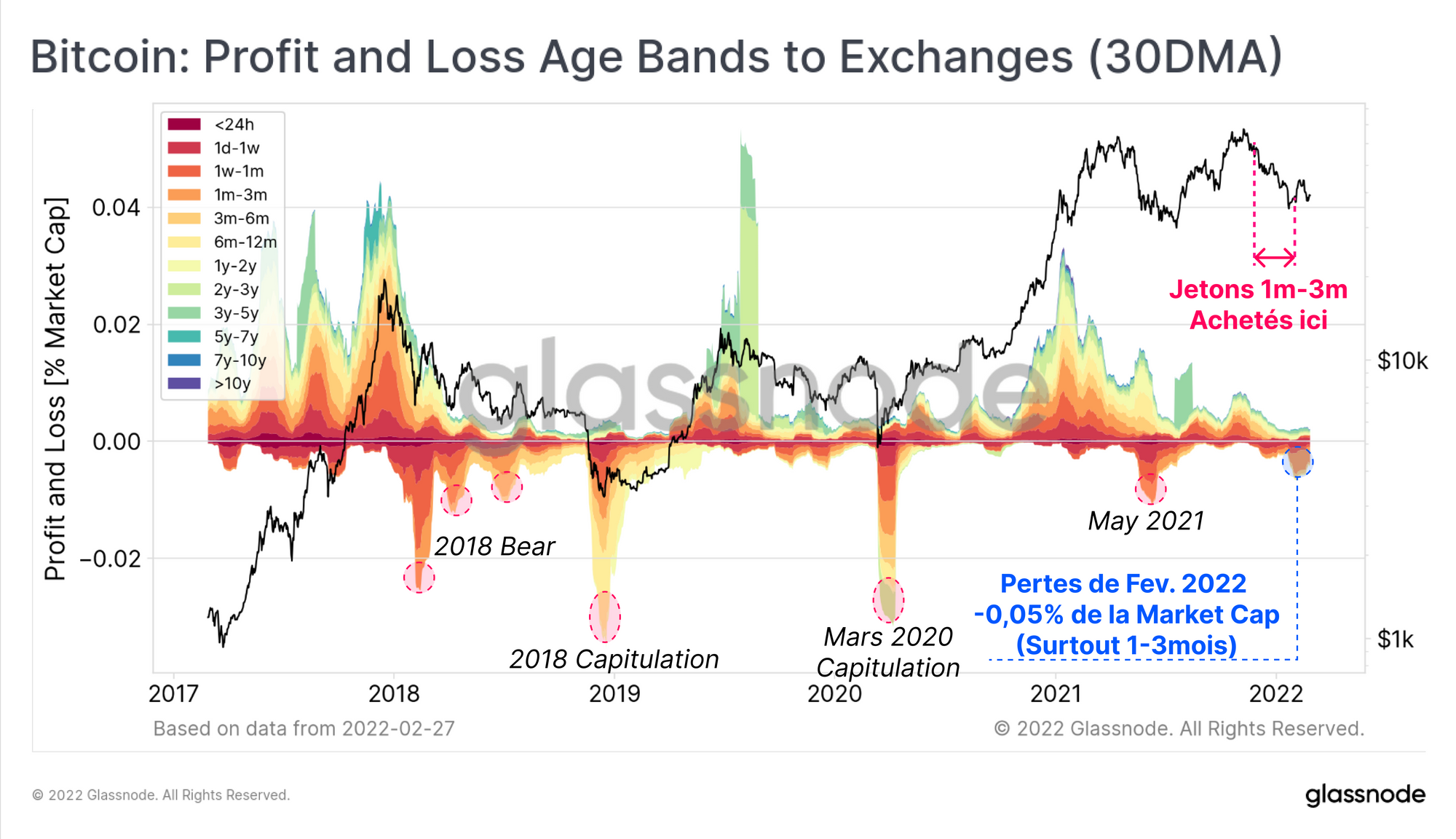 Le marché actuel est extrêmement intéressant, tant du point de vue de la chaîne que du point de vue macroéconomique. Compte tenu de l'énorme ampleur de l'incertitude et du risque qu'un conflit cinétique introduit, il faut être prudent et s'attendre à une délestage accru, à une panique des investisseurs et à des événements de capitulation. Jusqu'à présent, cependant, nous n'avons pas vu d'événement de capitulation généralisée, à l'exception des détenteurs à très court terme qui ont acheté l'ATH ou des creux prématurés pendant cette baisse. Il convient de noter que de nombreux signaux de'demande exagérés' restent bien en deçà des niveaux du marché haussier (abordés la semaine dernière).