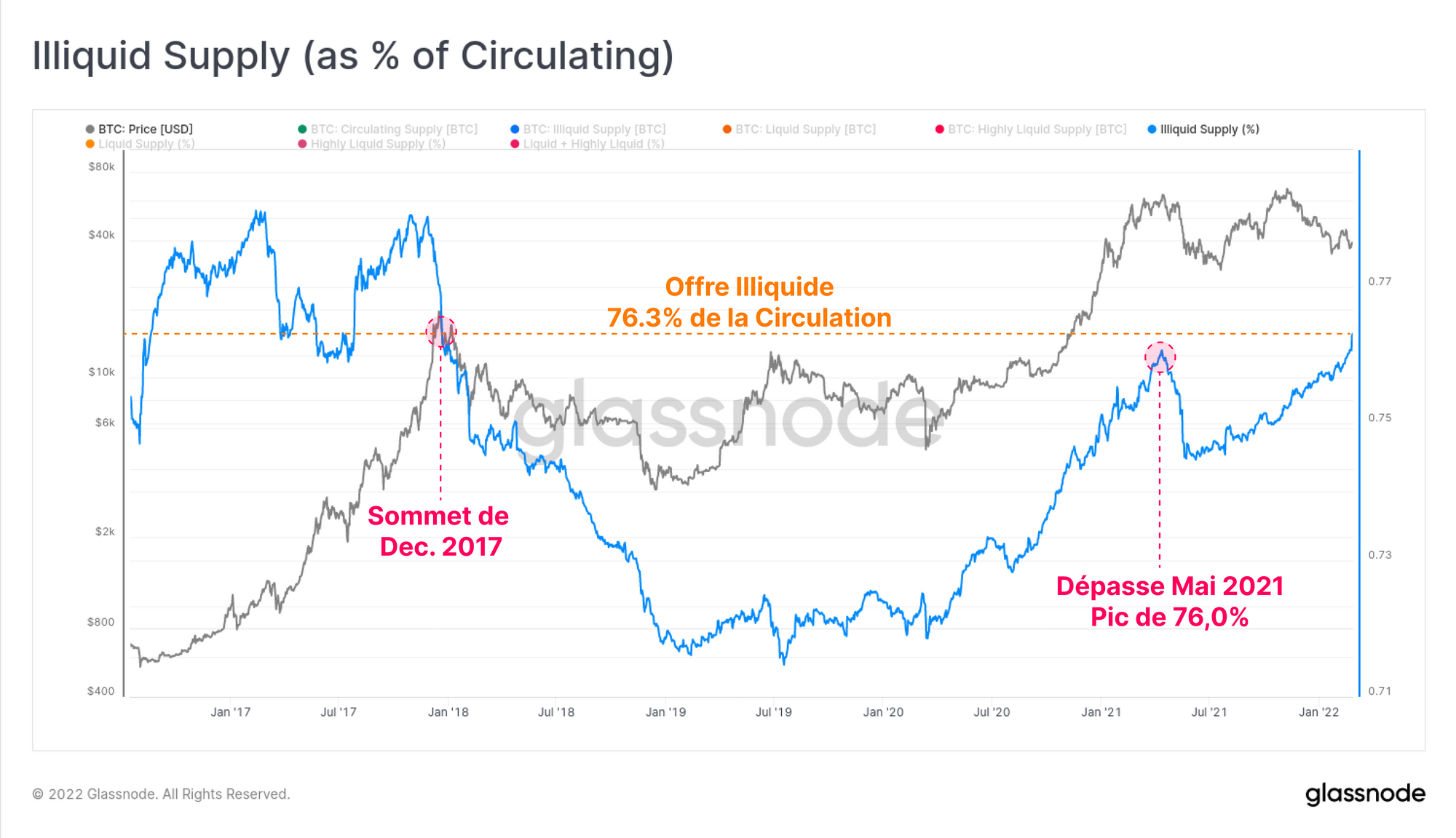 En proportion de l'offre en circulation, l'Offre Illiquide a maintenant dépassé le pic de mai 2021, atteignant 76,3 %. Elle est revenue au même niveau que le sommet du marché de 2017, inversant ainsi une augmentation de quatre ans de la liquidité des portefeuilles. Il convient toutefois de noter que ces deux cas ont précédé des ventes importantes et qu'il reste donc à voir si ces jetons ont vraiment été retirés de la liquidité.