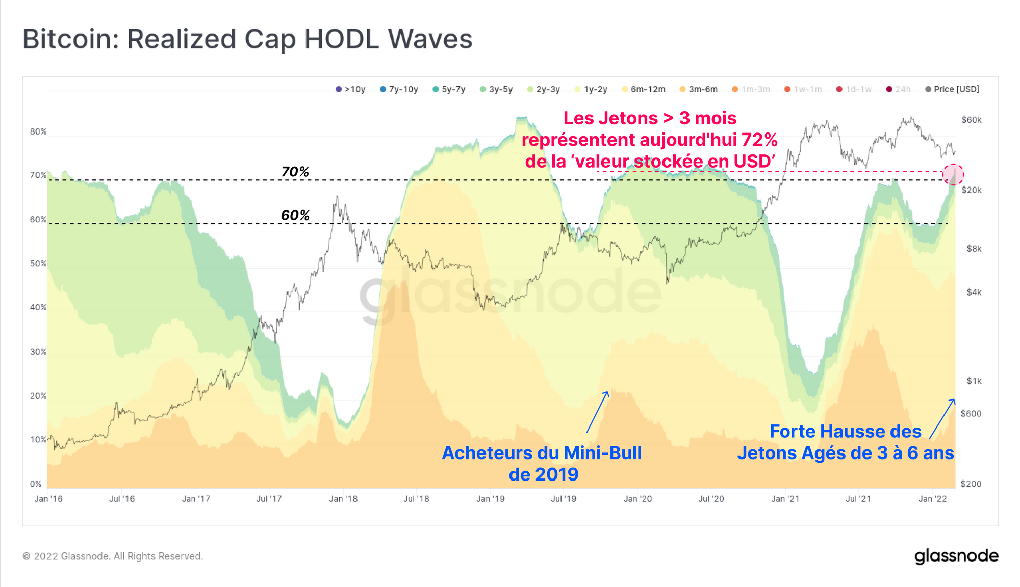 Dans le même ordre d'idées, les Realized Cap HODL Wave Bands de plus de 3 mois atteignent de nouveaux sommets locaux de 72 %. Cela signifie que 72 % de la valeur du dollar américainc 'stockée en bitcoin' est détenue par des jetons de 3 mois et plus.