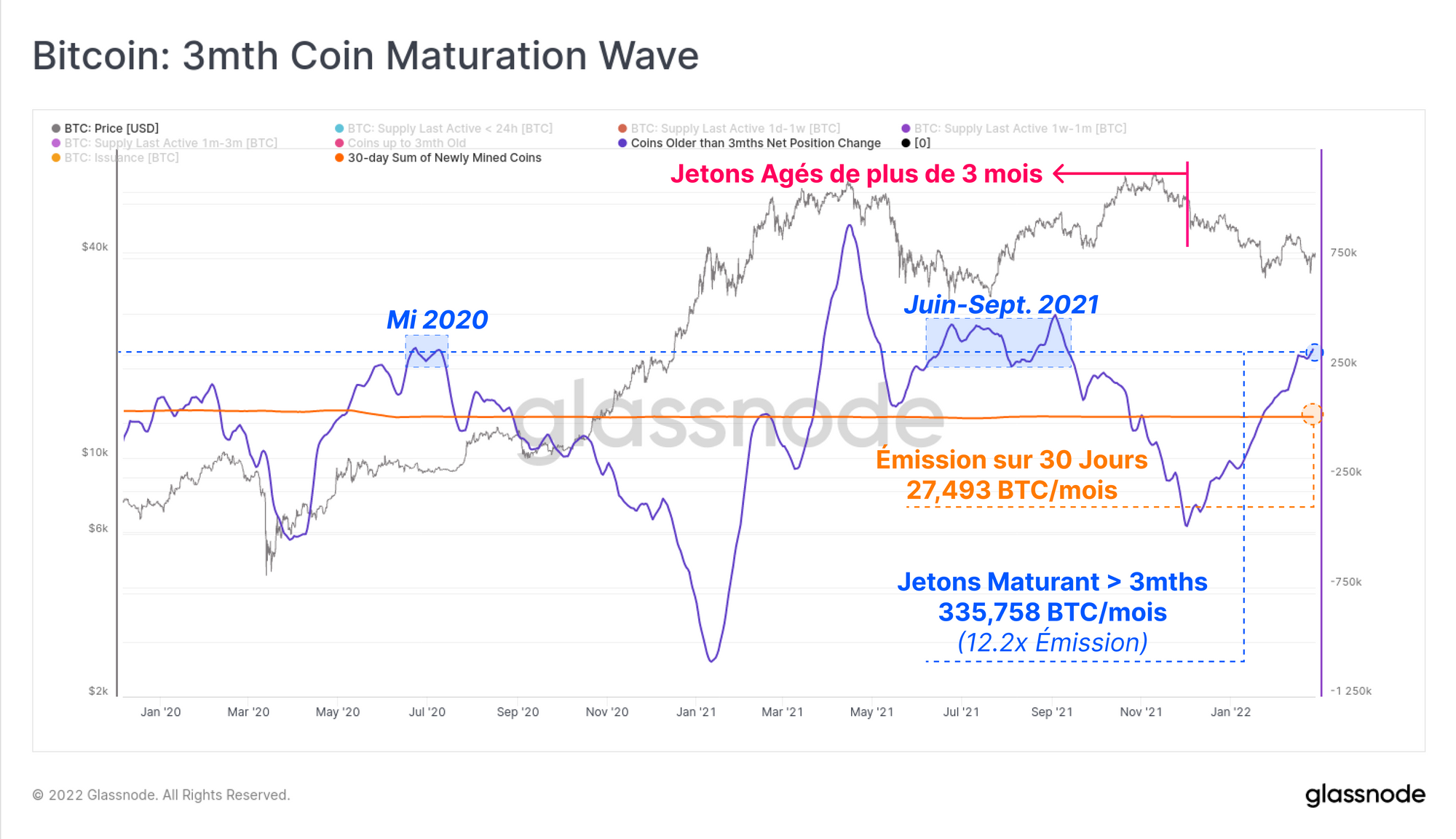 À l'heure actuelle, plus de 335k BTC atteignent l'âge de 3 mois et plus par période de 30 jours, ce qui représente 12,2 fois l'émission quotidienne de jetons des mineurs. Un comportement de HODLing d'une ampleur similaire a été observé à la mi-2020 et entre juin et septembre 2021, deux périodes qui ont précédé de puissants mouvements haussiers.