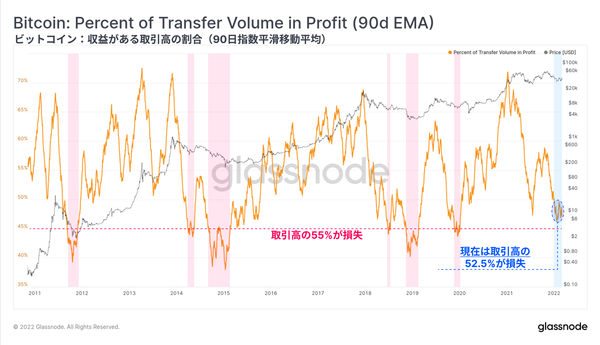 また、オンチェーン取引高に占める利益の割合も歴史的な低水準に近く、今週は47.5%に達している。この観測を裏返してみると、全取引高の半分以上(52.5%)が現在損失で費やされていることが推論される。過去の弱気サイクルの最終段階(赤色で示した部分)では、全取引高の55%以上が損失であった(キャピチュレーションイベント)。