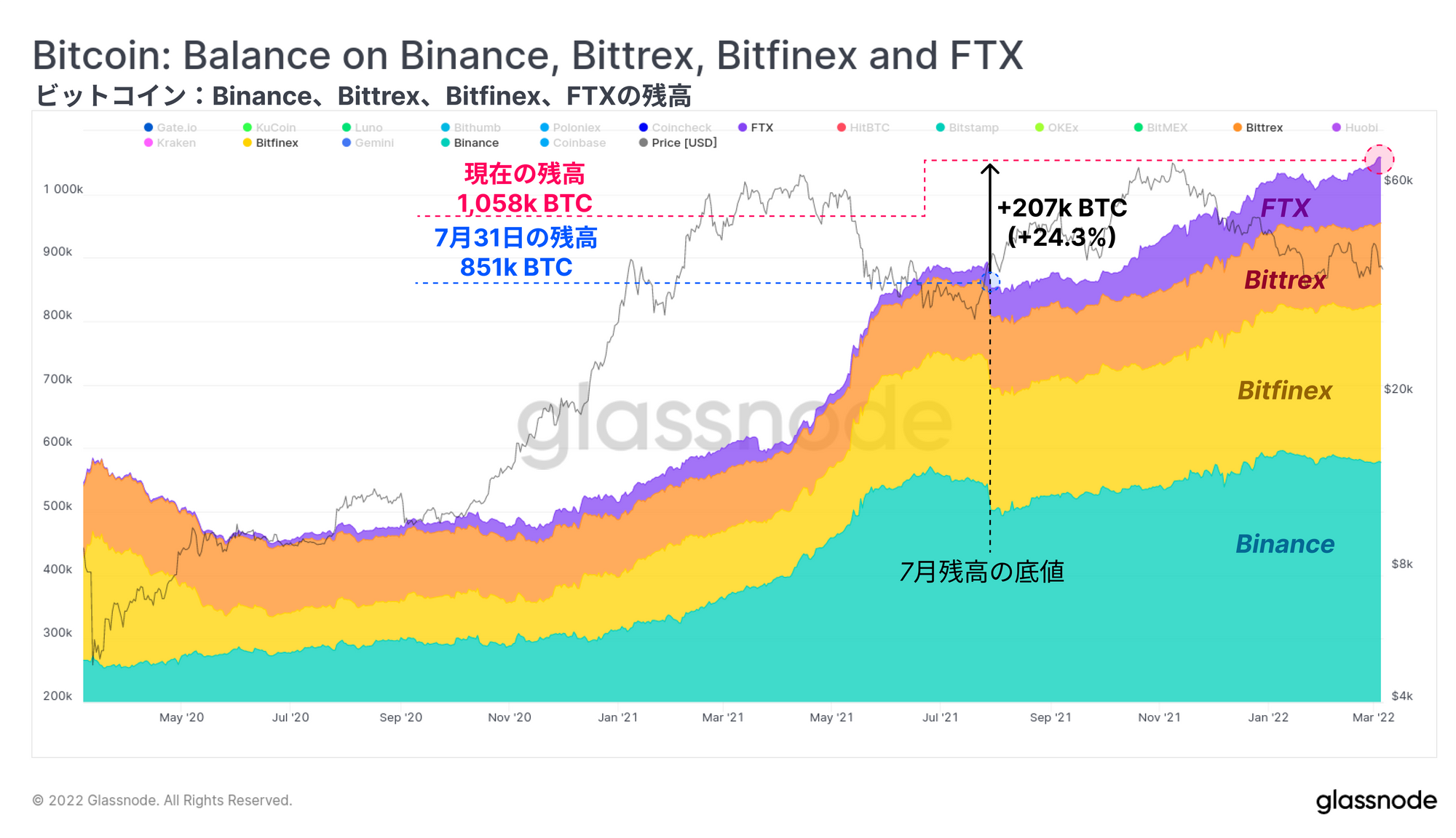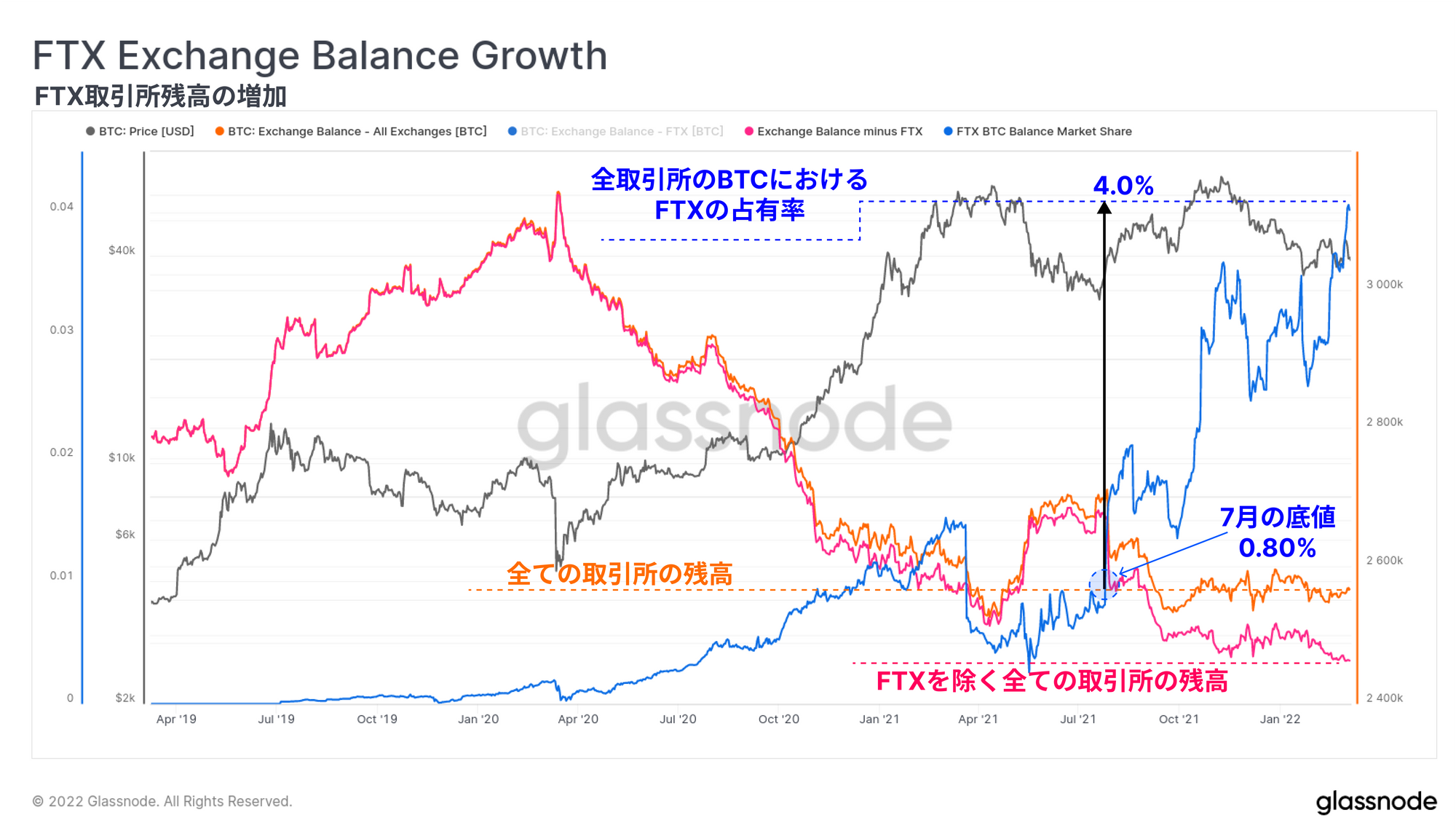FTXのBTC保有量は現在10万3千2百BTCと推定され、2020年3月のわずか3千BTCの保有量から異常な伸びを見せている。これは、2021年7月に0.8%だった残高占有率が、現在では4.0%に増加していることを意味する。