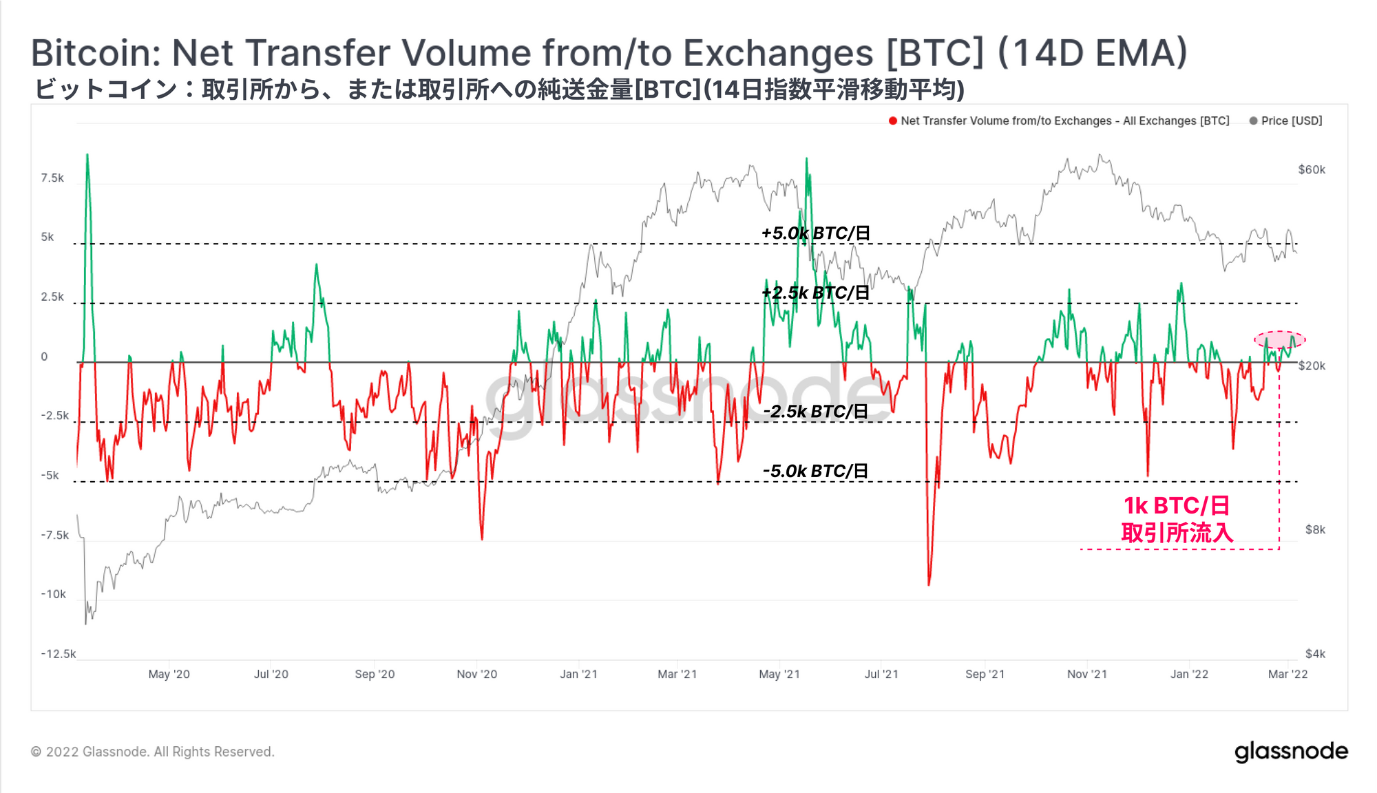 なお、上記の4つの特徴のうち3つは取引所への流入に偏っている。2020年3月の売り相場以来、取引所から総計575,876BTC(供給量の3.655%)の流出が印象的だったのはこのためでもある。また、2021年9月以降は相対的な均衡状態が成立していることにも注目したい。