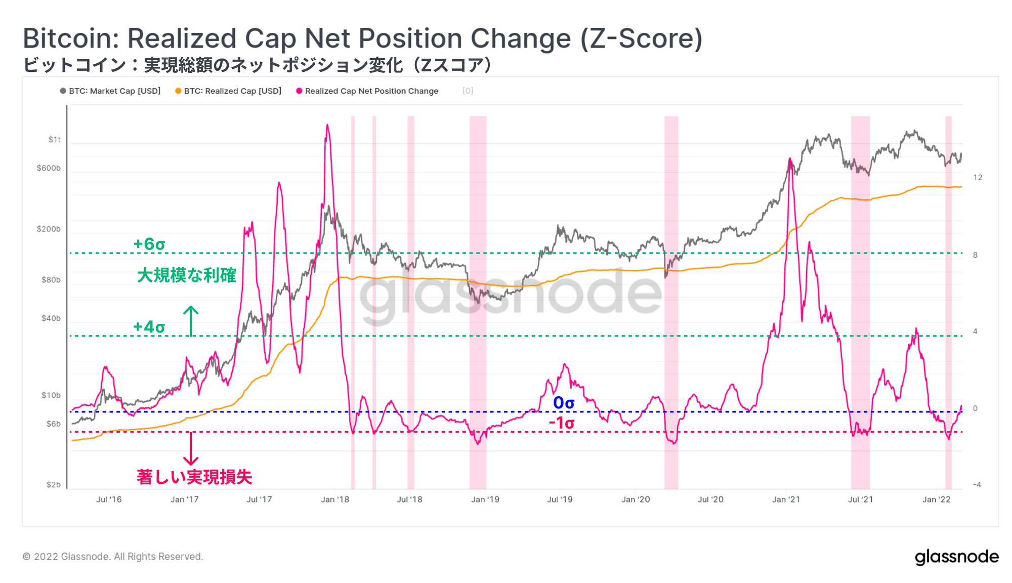 最後に、実現総額の30日間における変化に注目する。この指標は、ネットワーク全体の利益/損失を示し、長期平均値からの標準偏差(Z-Score)として表示される。