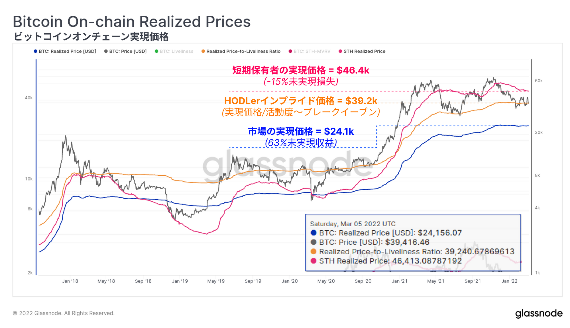 ・短期保有者の実現価格は現在$46,400で取引されており、したがって15%の総未実現損失を保有していることになる。この指標は、過去155日以内に移動したすべてのコインを反映したものである。