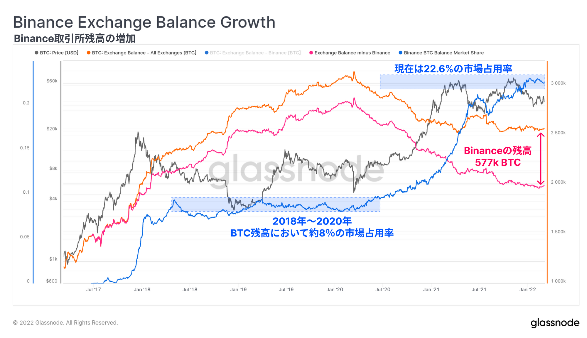 しかしながら、Binanceが市場シェアの占有率において最も見事な成長率として冠を獲得しており、2018-20年に比較的安定していた8%のBTC残高占有率から、現在においては22.6%超まで上昇している。Binanceで保有されている総残高は、2020年3月以降31万5千BTC増加しており、わずか2年で120%も増加している。