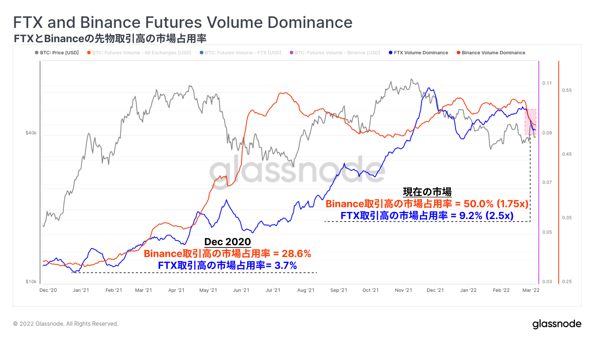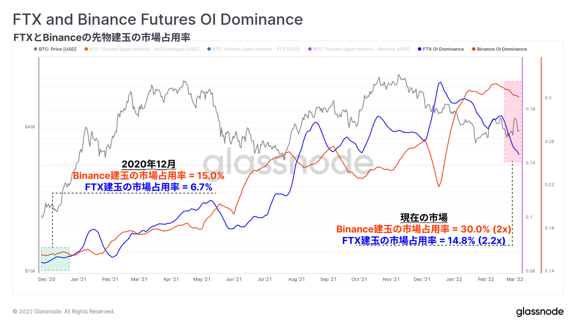 BTC残高の増加と並行して、BinanceとFTXの両社は、2020年12月以降において先物市場での占有率が2倍以上になっている。Binanceの先物建玉のシェアは15%から30%に増加し、FTXは6.7%から14.8%超に上昇した(2.2倍の増加)。