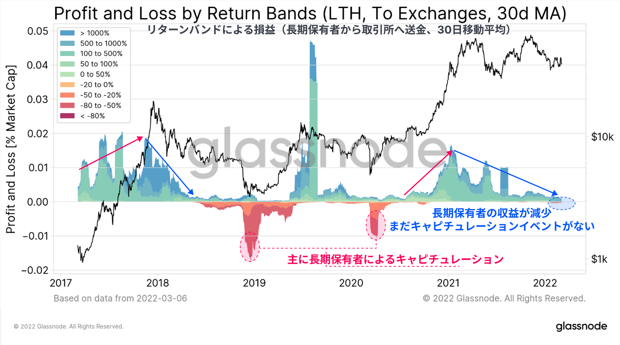 短期保有者と長期保有者の損失規模が歴史的に小さいということは、売り手が全面的に崩れになる可能性が高まっている。しかしながら、短期保有者と長期保有者の両方が最終的かつ完全にキャピチュレーションするリスクは引き続き注視すべきであり、過去に多くの前例がある。