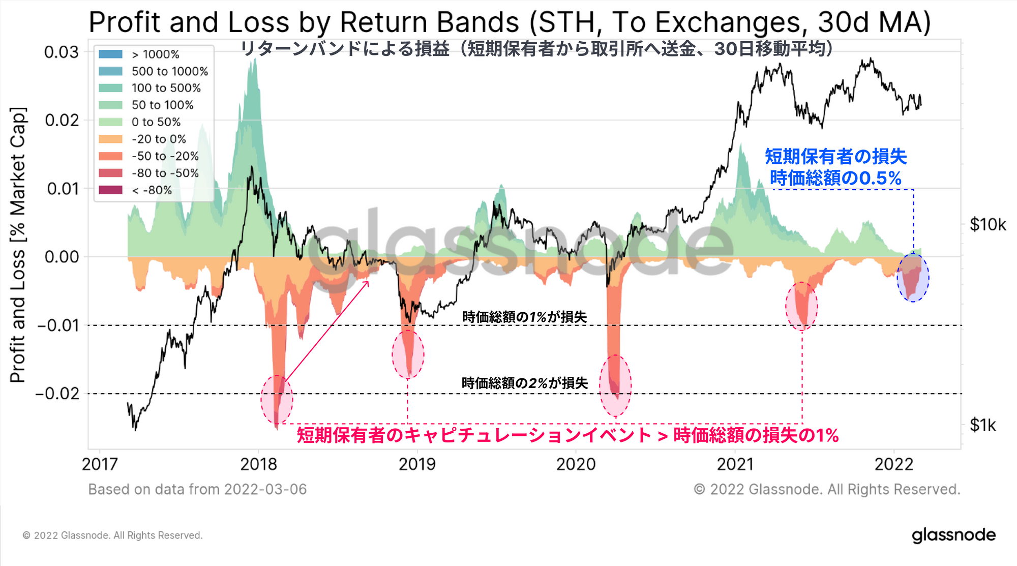 次のグラフは、取引所に送られたコインについて、短期保有者がどの程度の損益を実現したかを示したものである。2ヶ月以上にわたって、1日あたり時価総額の約0.5%に相当する自明でない損失が続いていることがわかる。この規模の損失は、2018年の弱気相場、2020年3月、2021年5月に見られた極端なキャピチュレーションレベルには遠く及ばない。