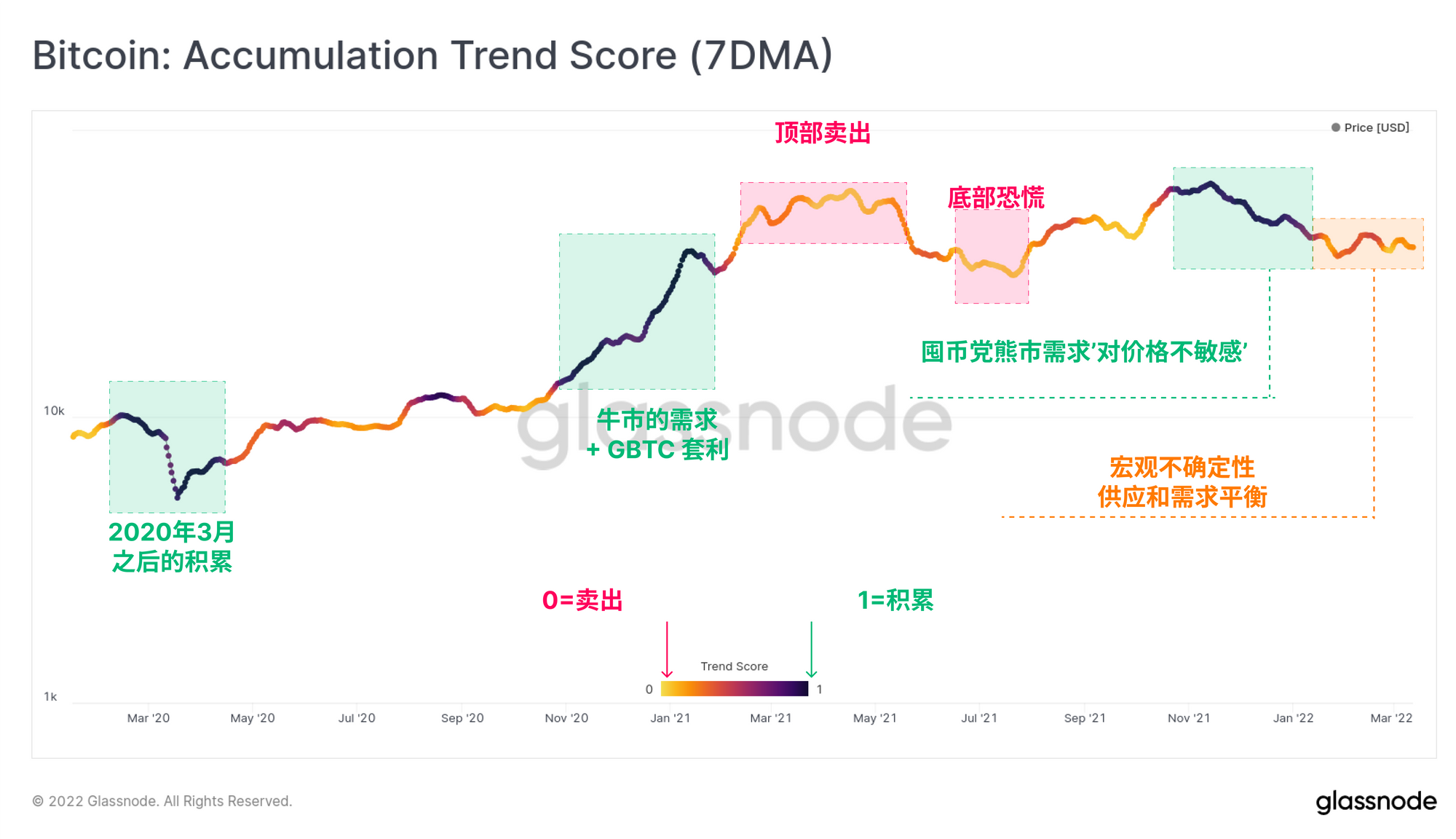 我们可以发现,2021年10月到2022年1月期间,积累非常强劲(>0.9,深紫色),可能是由对价格不敏感的囤币党驱动。然而,在2022年的大部分时间里,这个指标一直在0.2和0.5之间波动。这突出了全球宏观不确定性对投资者情绪的影响,因此出现了较弱的积累。