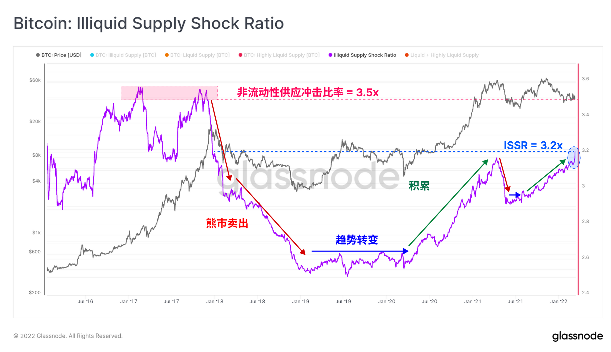 随着更多的比特币转移到这种钱包中,这一指标将呈上升趋势,我们可以看到,目前它的市场结构与2018-20年的熊市相似,尽管时间尺度较短。ISSR指标目前为3.2,这意味着非流动性钱包中持有的供应量比流动性和高流动性供应量的总和还要大3.2倍。