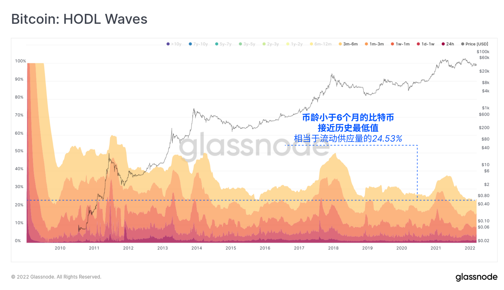 囤币波指标也显示币龄小于6个月的比特币处于历史最低点。24.53%的流通供应量属于这个年龄组,这意味着75.47%的供应量在6个月以上的时间里一直处于休眠状态。