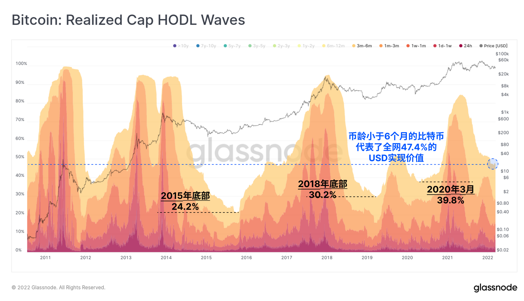 晚期熊市的特点同样是这些币龄较年轻的币所持有的资本比例较低,因为币在较长期的投资者钱包里逐渐成熟。特别是3个月-6个月币龄段(下图中的黄色带顶部)目前正在大幅膨胀,表明去年9月至12月期间购买的大量供应仍被投资者坚定地持有。