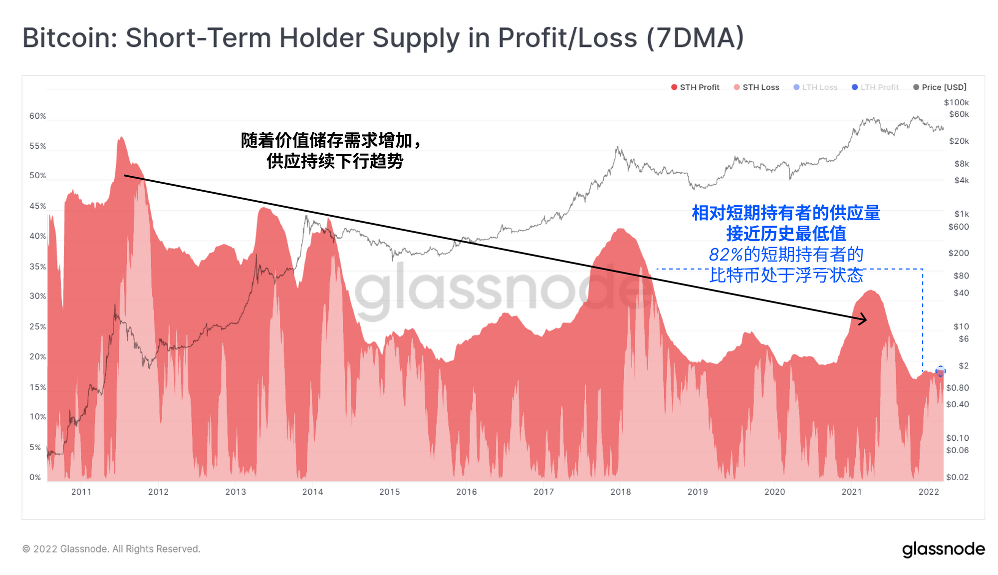 - 短期持有者持有的82%的供应量(251万枚BTC), 目前以浮亏形式持有,而长期持有者持有的总供应量接近历史最高水平.
