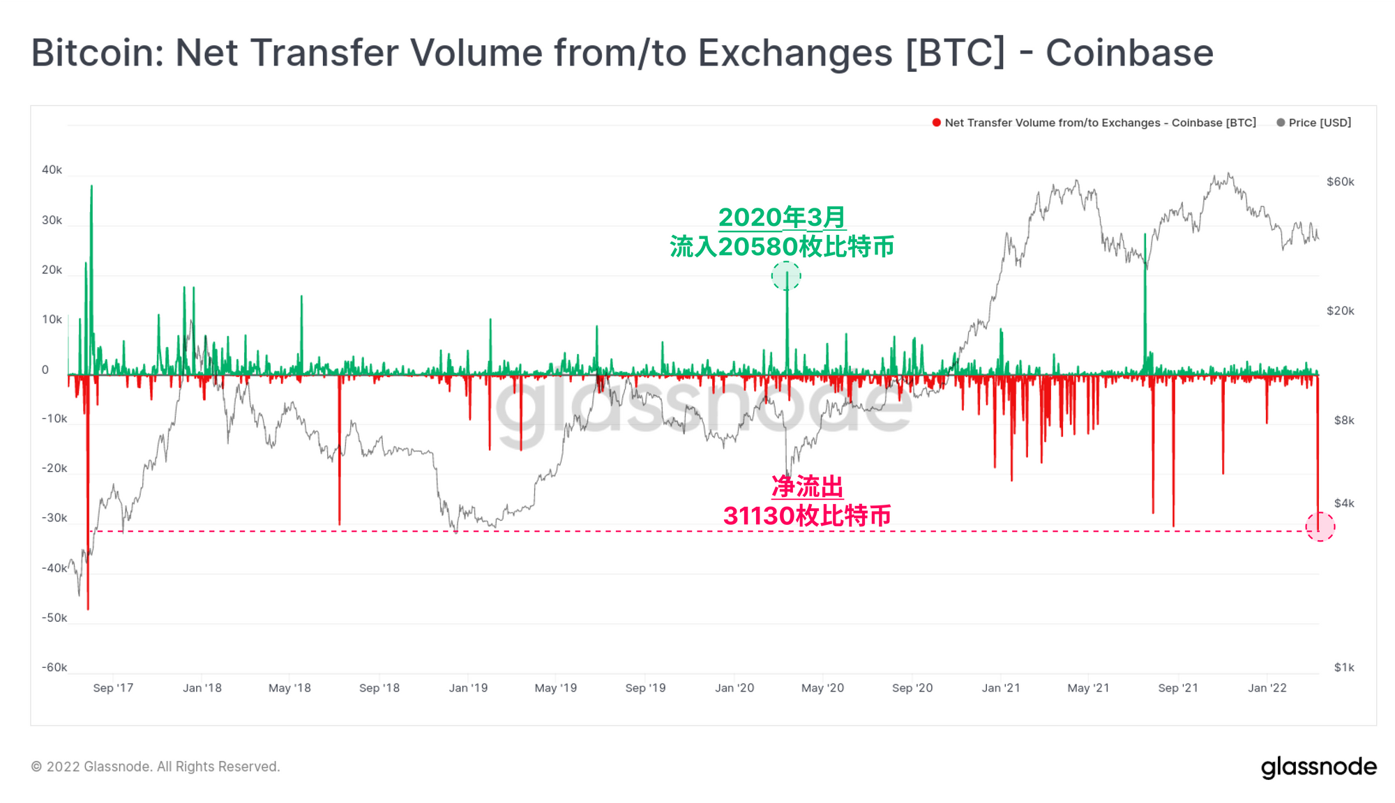 Coinbase本周出现了非常大的比特币净流出,总额为31,130枚BTC(11.8亿美元)。这是自2017年7月28日以来的最大净流出。在下图中,2020年3月之后的净流出模式(红条)也相当明显。这仍然是一个强烈的信号,投资者越来越多地将比特币视为现代投资组合的相关资产。