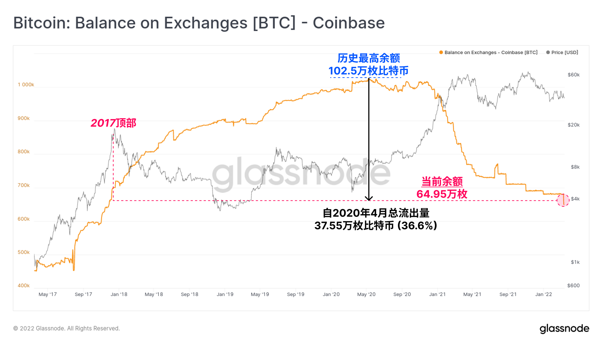 这种大规模的流出造成Coinbase持有的总余额下降到64.95万枚BTC,Coinbase一夜之间回到了2017年牛市顶部期的水平。Coinbase持有的比特币总余额现在已经从2020年4月达到的历史最高值下降了37.55万枚BTC(36.6%)。