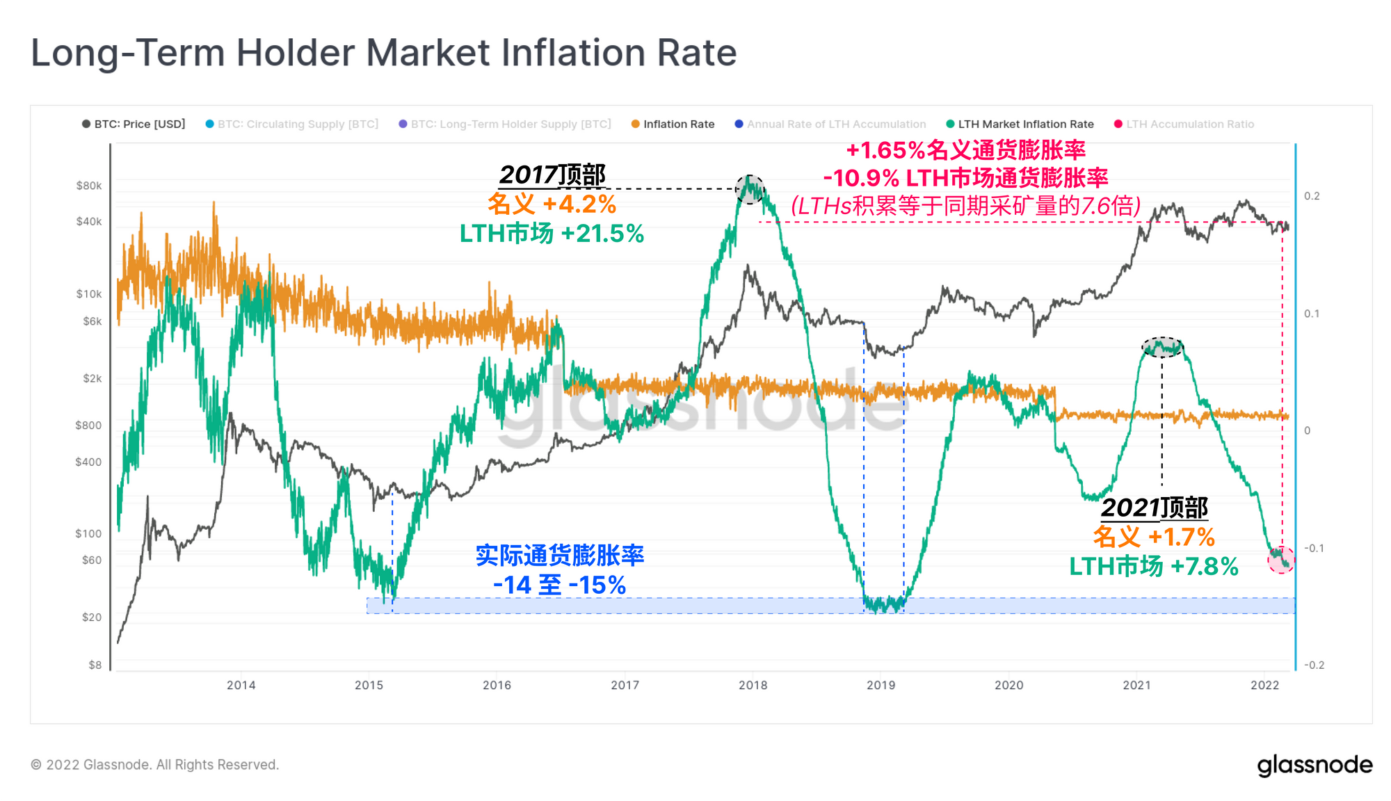 最后,我们将这个LTH积累率与名义通货膨胀率相加,计算出市场通货膨胀率(绿色线)。我们可以观察到: