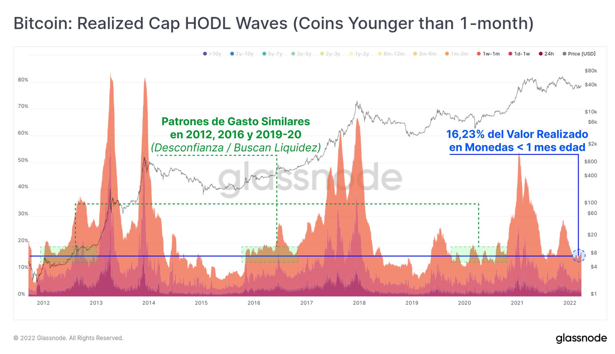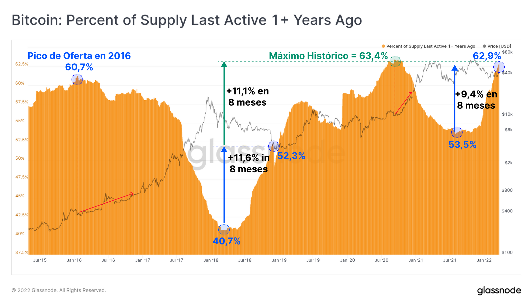 Al ir acercándonos ya al término del primer trimestre de este año 2022, podemos observar un extraordinario crecimiento en la proporción de monedas de más de 1 año de edad, que ha aumentado en un 9.4% de la oferta en circulación en los últimos 8 meses. Estas monedas son reflejo de los volúmenes de BTC que se acumularon durante la fase del mercado alcista del primer trimestre del 2021, por lo que sus dueños ya han soportado dos desplomes de más del 50%, y tres nuevos máximos históricos. Esta recuperación se asemeja mucho en cuanto a la escala y duración de la recuperación del 2018-19.
