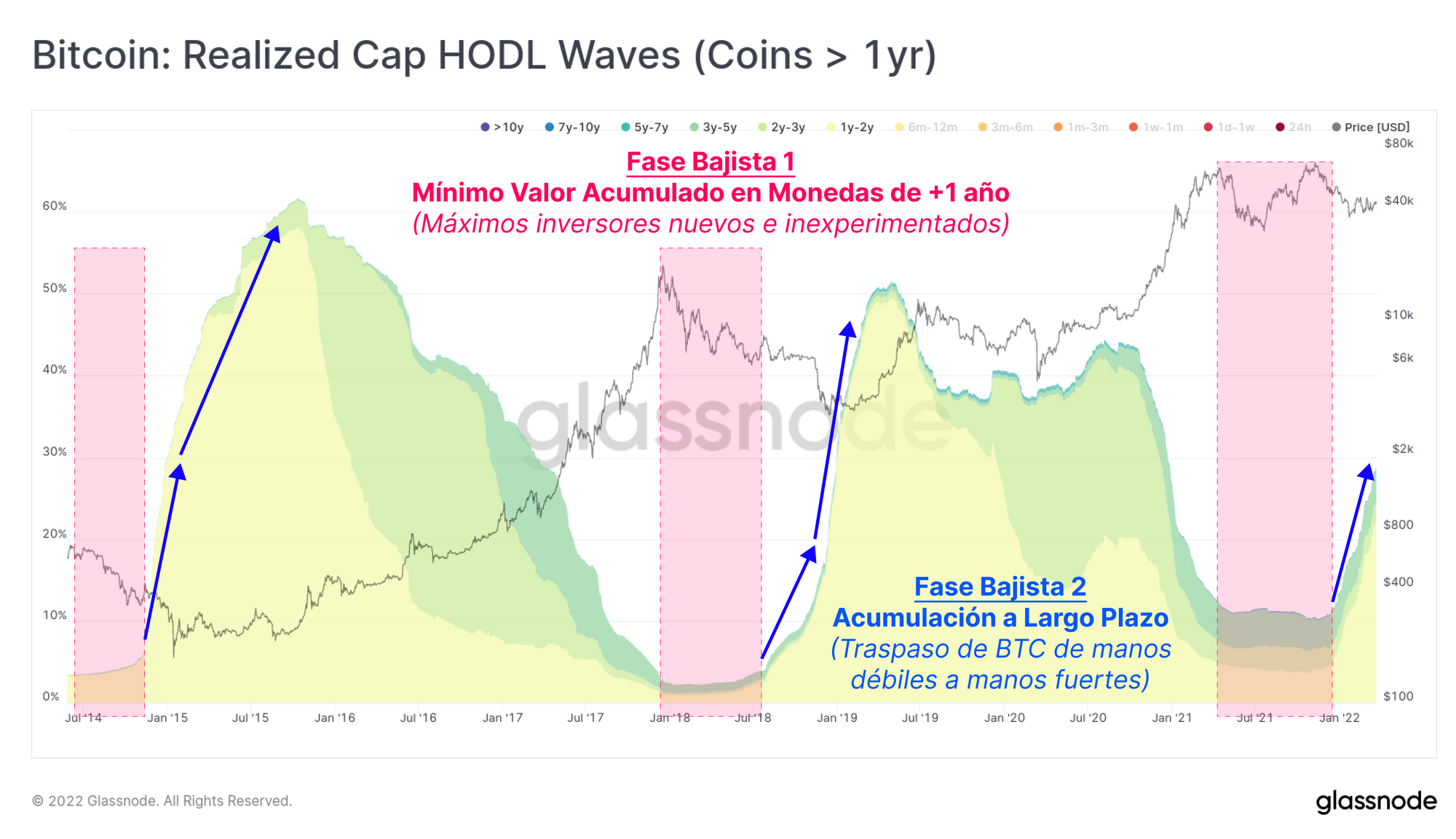 - El periodo que abarcó del segundo al cuarto trimestre del 2021 guarda parecido con los mercados bajistas anteriores donde la riqueza total almacenada en monedas de más de 1 año de edad alcanzó el mínimo de ciclo entre mayo y diciembre del 2021.