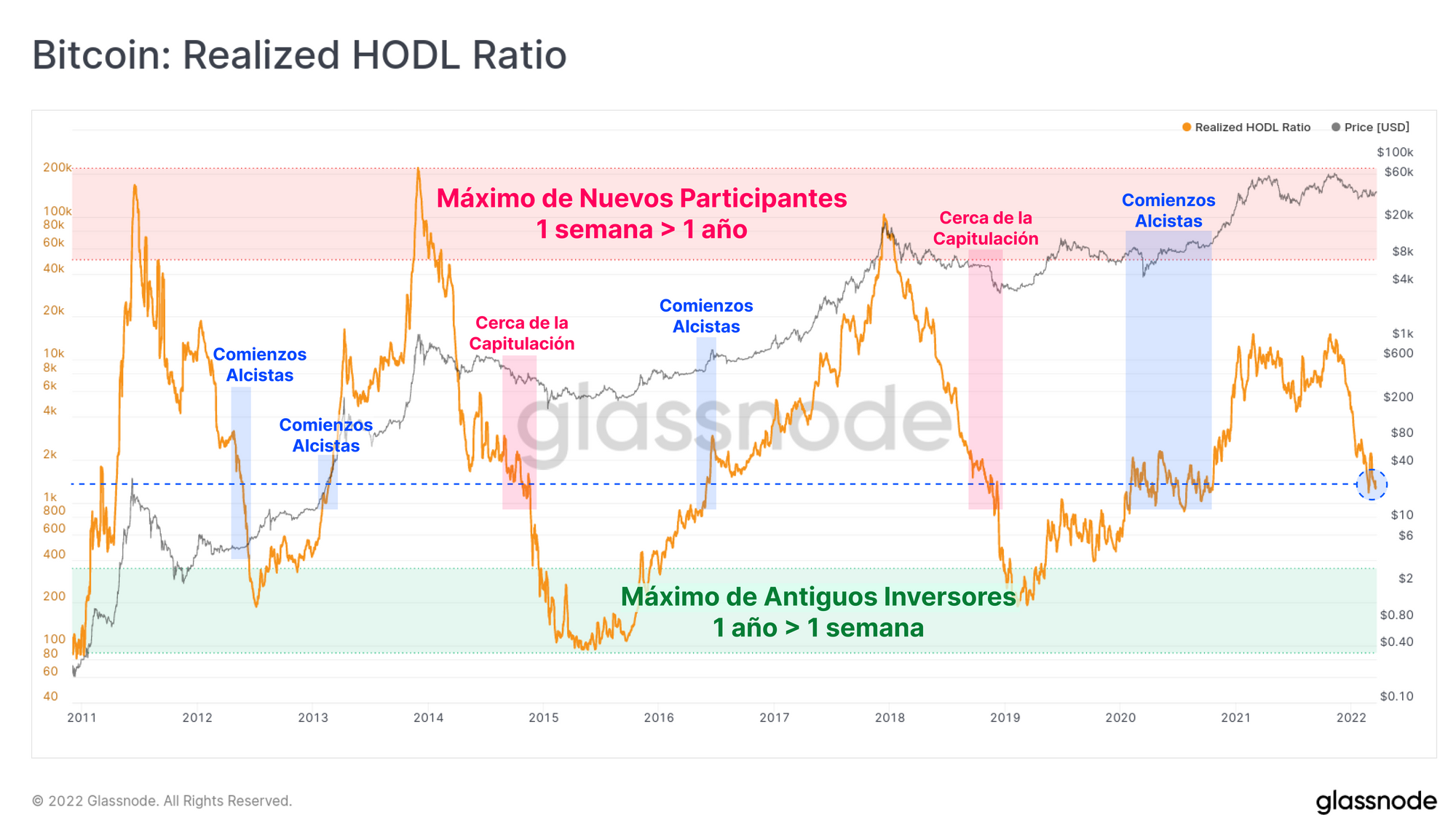 Vemos que ahora está en marcha una macro tendencia bajista, reflejada en el aumento de las monedas de más de 1 año que se abren hueco en el denominador de la métrica. Este Ratio nos muestra un equilibrio en estos momentos entre los nuevos inversores y los HODLers más experimentados, que concuerda con lo que solemos encontrar durante los estadios finales de los mercados bajistas, y también al comienzo de los mercados alcistas. Aunque hay que tener en cuenta que sólo durante el año 2012 mantuvo el ratio una macro tendencia bajista, mientras que el precio de mercado seguía una trayectoria alcista.