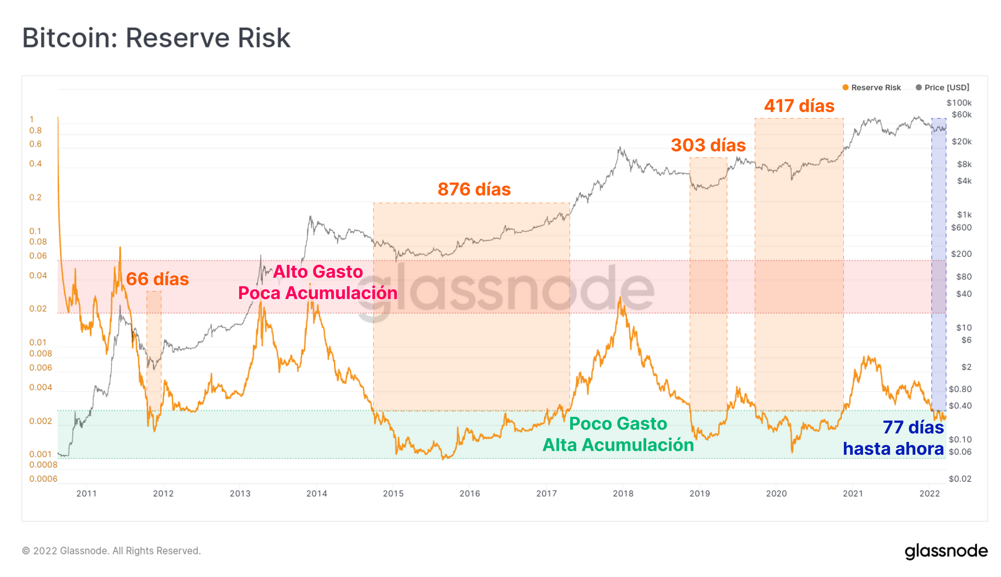 Otro oscilador que captura una impresionante cantidad de psicología inversora en una elegante curva es el Riesgo de Reserva. Esta métrica mostrará valores más bajos cuanto más potente sea la acumulación inversora e invertir a largo plazo sea la estrategia favorita en el mercado. Y al contrario, es extremadamente revelador hacia valores elevados (requiere escala logarítmica) cuando los inversores experimentados sueltan sus posiciones.