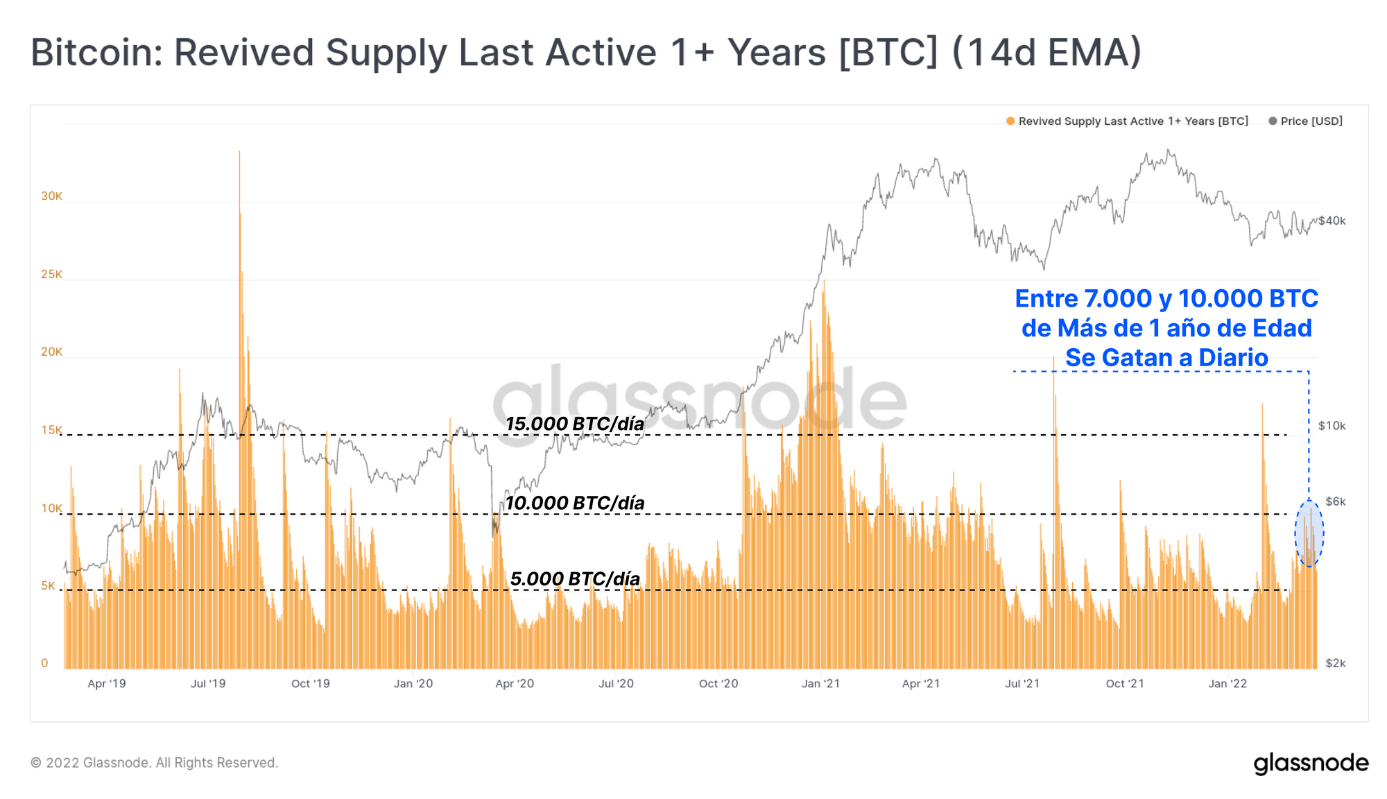 Es algo que se confirma de nuevo cuando observamos la Oferta Renacida de más de 1 año de edad, demostrando que entre 7.000 y 10.000 BTC de más de 1 año de vida se han estado gastando diariamente a lo largo de los últimos 30 días. De esto se deducen dos interpretaciones: