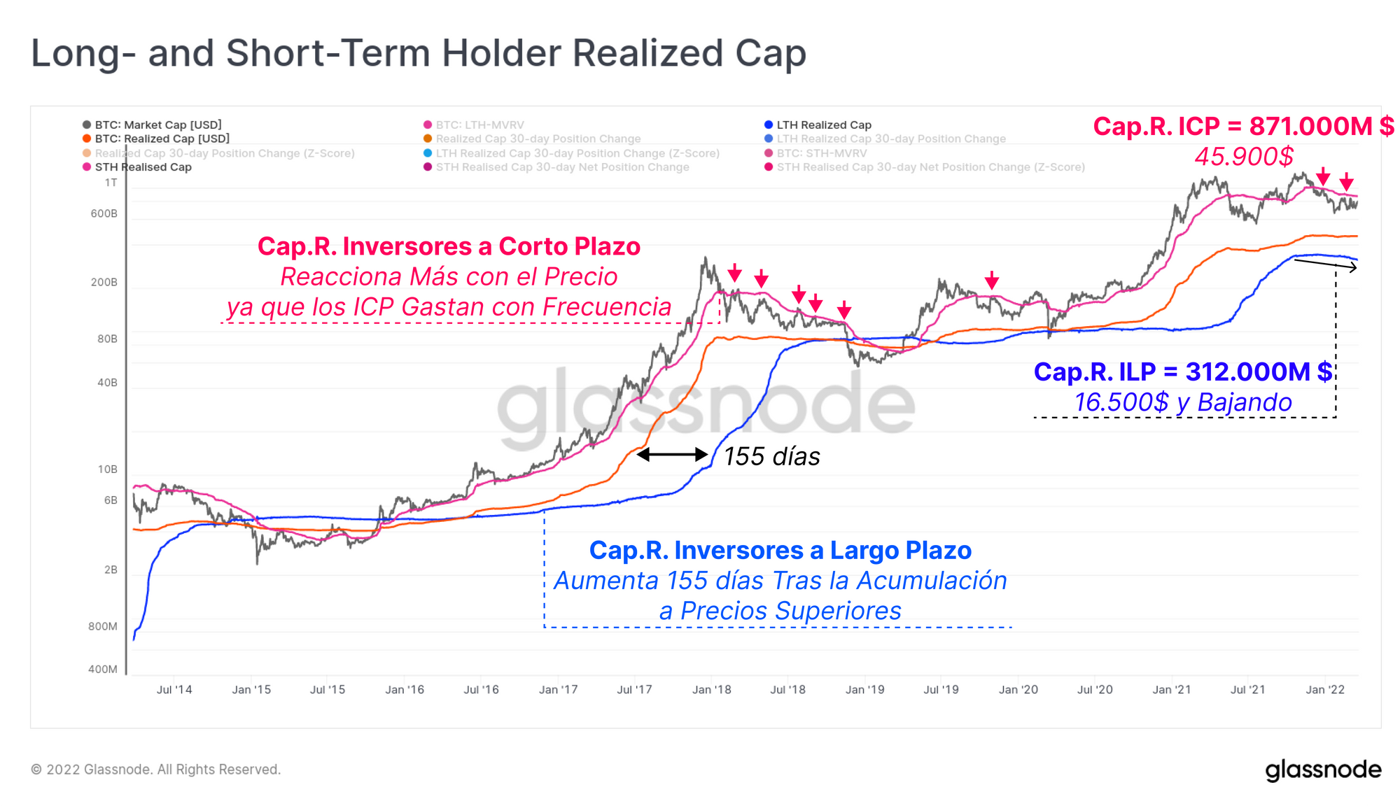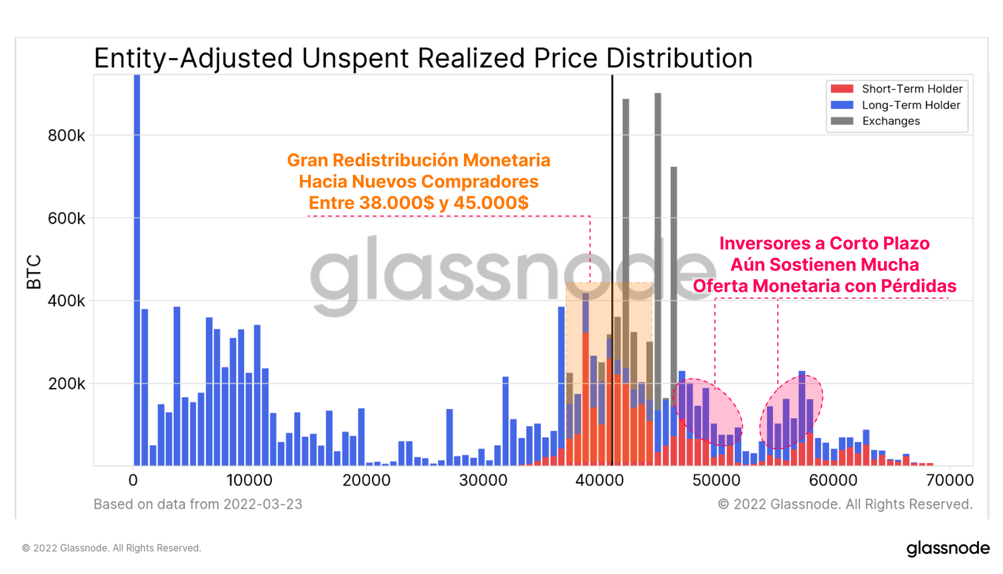 - Los Inversores a Corto Plazo han acumulado una gran proporción de la oferta entre los 38.000$ y los 45.000$. Quiere decir que muchos inversores consideran el actual rango de consolidación una zona de alto valor, y por eso tiene unas características similares al rango entre los 30.000$ y 40.000$ que formamos entre mayo y julio del pasado año 2021.
