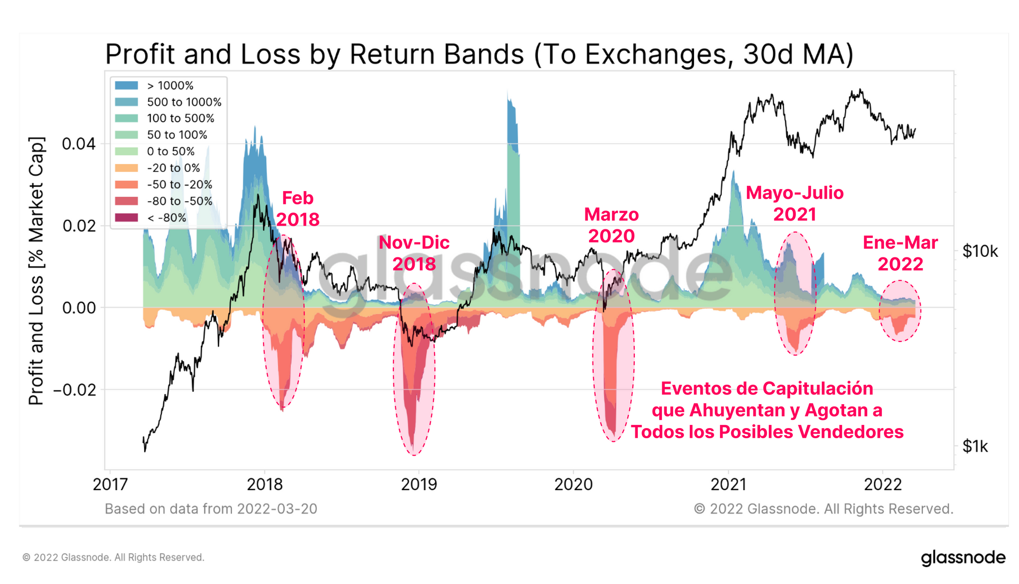 Cuando suceden estos eventos, todos los posibles vendedores quedan exhaustos, y típicamente encontramos que se venden a gran escala tanto monedas en ganancias, como monedas en pérdidas. La siguiente gráfica muestra el grado de ganancia/pérdida realizada específicamente por monedas enviadas a los exchanges (con casi toda certeza para venderse).