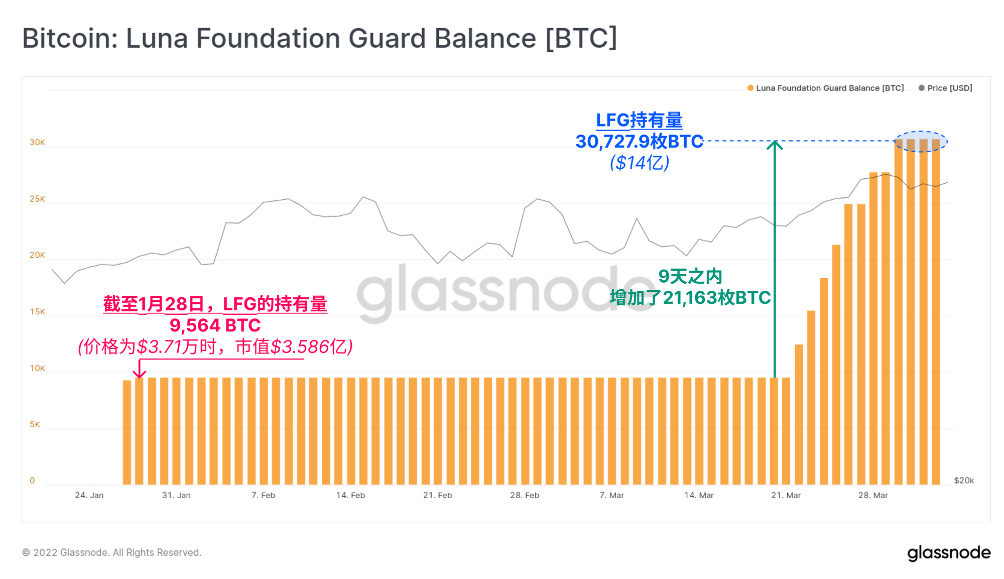 我们已经确定,在过去两周内,鲸鱼实体(持仓量>1000枚比特币)正在积累大量的比特币。公开的实体之一是Luna Foundation Guard (LFG),它现在已经积累了30727枚比特币。1月下旬,LFG最初购买了9564枚比特币,当时的价值为3.586亿美元,现在LFG的余额在9天内增加了21163枚比特币。LFG余额的总价值现在超过14亿美元。