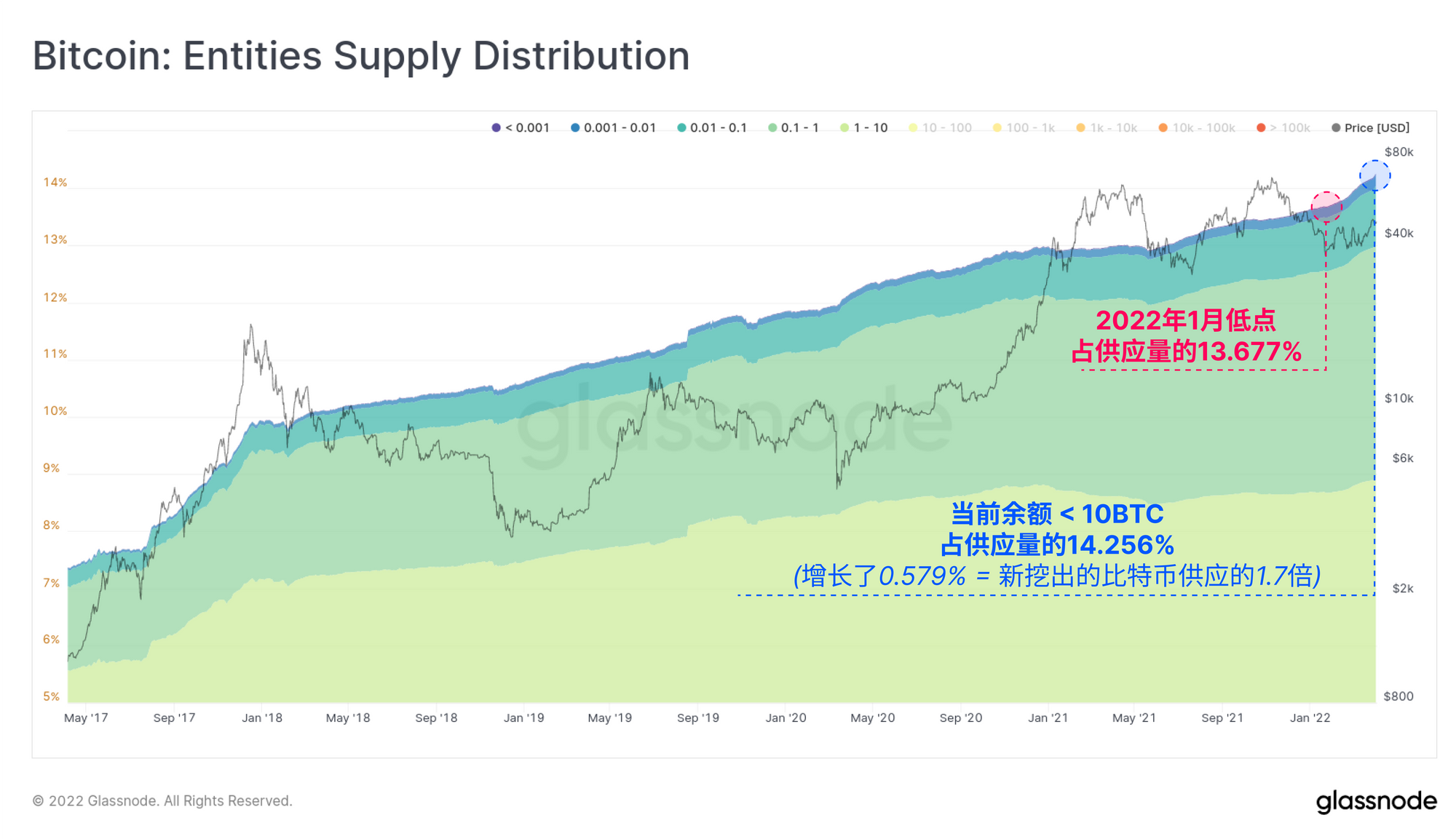 比特币虾米目前累计持有14.256%的比特币供应量(注意,这不包括交易所持有的任何供应量,这代表了额外的数千到数百万的散户的总量)。