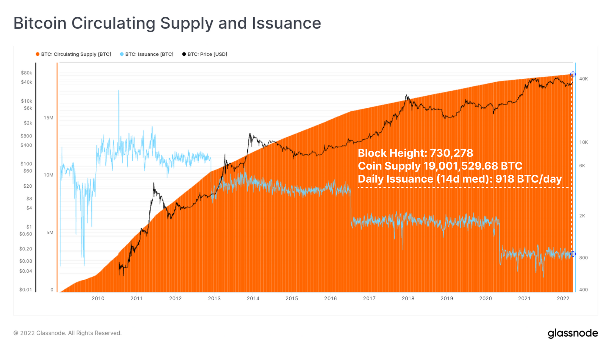 مجموعا تا هفته اخیر ۱۹ میلیون بیتکوین استخراج شده است. تنها ۹.۵۲ درصد از ۲۱ میلیون بیتکوین، باقی مانده که مطابق الگوریتم شبکه تقریباً تا ۱۱۸ سال دیگر، استخراج باقیمانده زمان خواهد برد. در زمان نگارش این شماره (تعداد بلاکهای ایجاد شده در شبکه، ۷۳۰,۲۷۸ هزار است) تعداد کل بیتکوین ها ۱۹,۰۰۱,۵۲۹.۶۸ عدد است و نرخ استخراج روزانه ۹۱۸ عدد بیتکوین است (میانگین چهارده روزه).