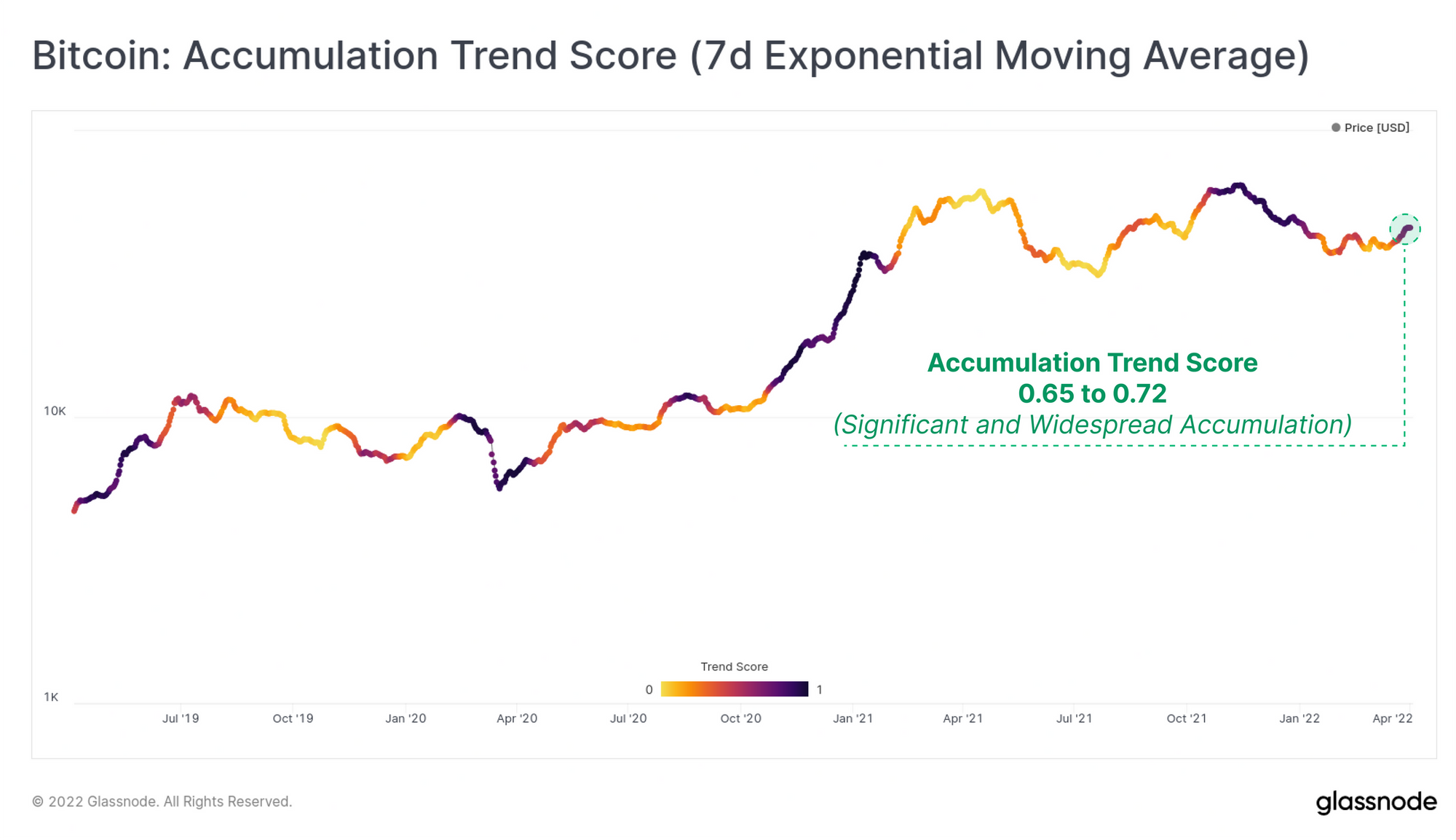 معیار Accumulation Trend Score, یکی از ابزارهای است که اخیراً در وبسایت گلسنود معرفی شده است. این معیار, شدت تغییراتی که در موجودی دسته-آدرسهای مجزا ایجاد شده را رصد میکند. اگر مقدار این معیار به عدد ۱(بنفش) نزدیک باشد یعنی نهنگها و یا بسیاری از دسته آدرسها، مقدار هنگفتی به موجودی خود اضافه میکنند. در این هفته این معیار تا عدد ۰.۶۵ پیش رفت که این یعنی بازار بهطور کلی روند انباشت داشته است.