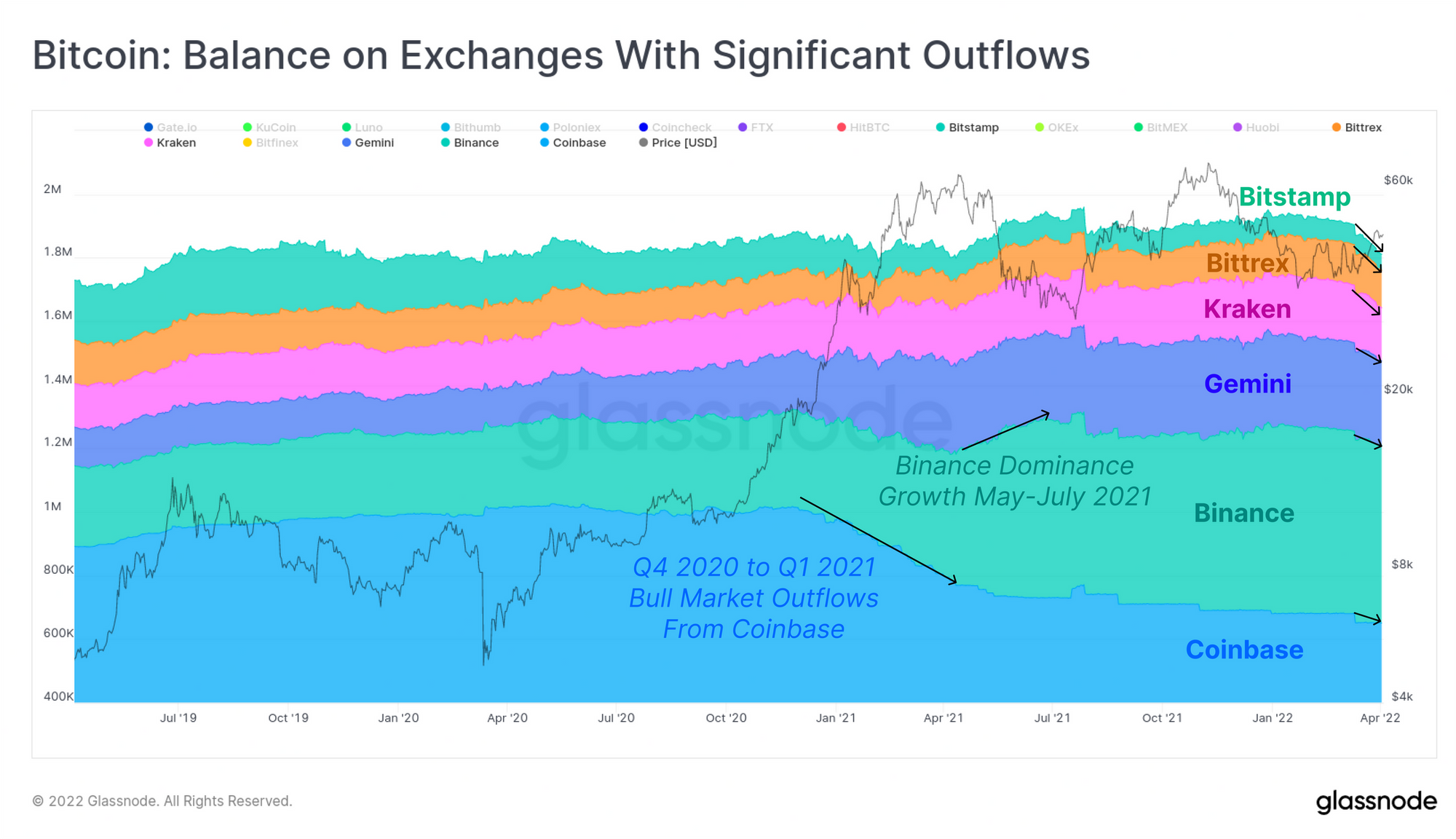 اگر صرافی ها را دقیقتر بررسی کنیم، میبینیم که بزرگترین صرافی ها، بیشترین میزان خروجی بیتکوین را داشتند. صرافی های Coinbase,Binance,Gemini,Kraken,Bittrex و Bitstamp، موجودی بیتکوین آنها در یک تا دو سال گذشته به صورت خالص افزایش پیدا کرده بود اما اخیراً بیتکوین بهصورت خالص از این صرافی ها خارج شده است. مخصوصاً میزان موجودی صرافی Binance که در سال ۲۰۲۱، بیشترین افزایش تعداد بیتکوین را داشته است اما در دو هفته گذشته، بیش از ۲۰ هزار بیتکوین از آن خارج شده است.