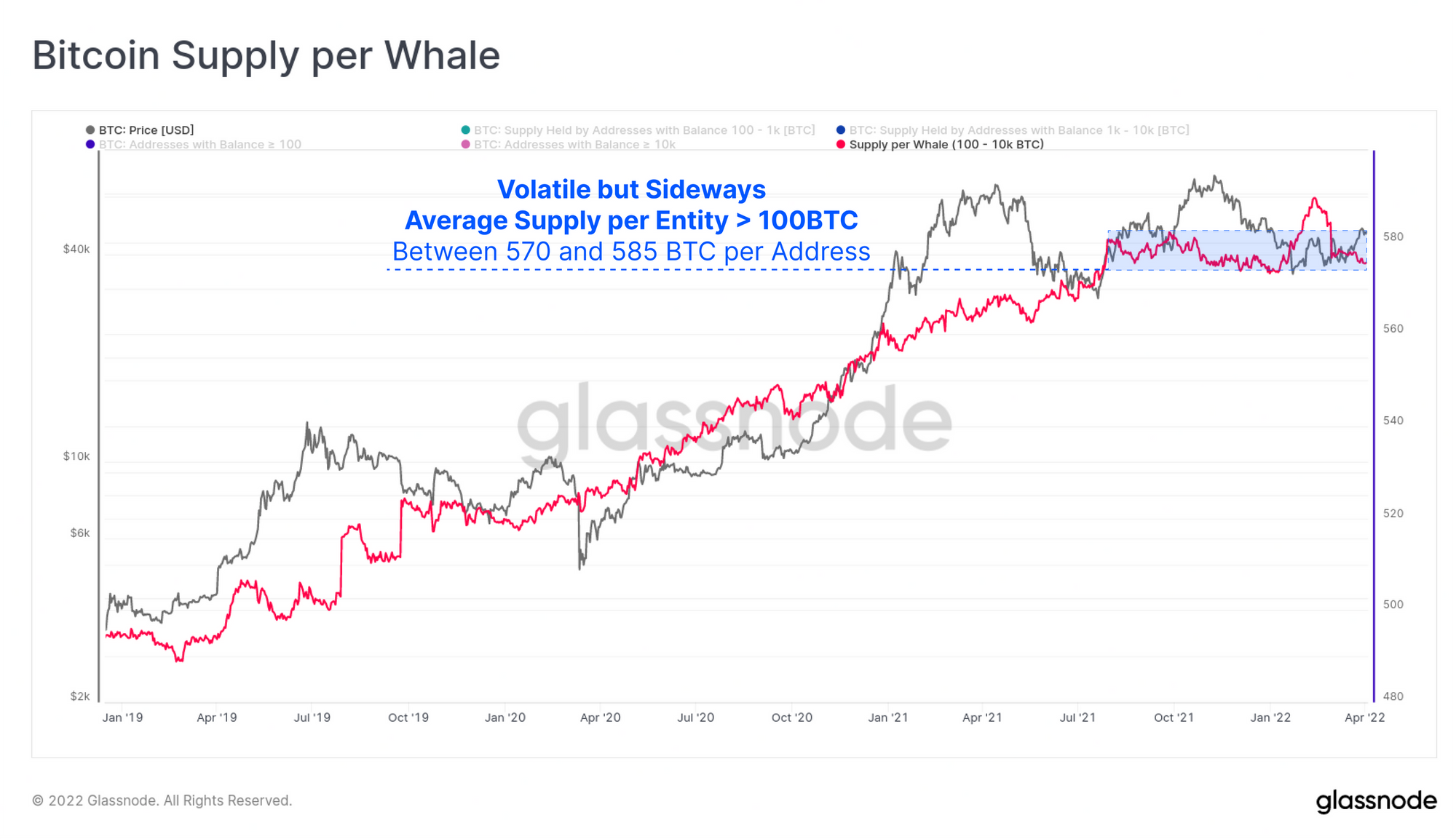 در مرحله بعد، آدرسهایی را بررسی میکنیم که میانگین موجودی آنها، از ۱۰۰ تا ۱۰ هزار بیتکوین است(موجودی کوسه تا نهنگ). از ماه اوت ۲۰۲۱, بهصورت میانگین تعداد بیتکوین هایی که در هر یک از آدرسهای این گروه هولد شده بین ۵۷۰ تا ۵۸۵ بیتکوین نوسان داشته زیرا موجودی و تعداد آدرسهای این گروه در این مدتزمان تغییری چندانی پیدا نکرده است. همه این موارد یعنی این گروه در روند فعلی انباشت کمترین سهم را دارند.