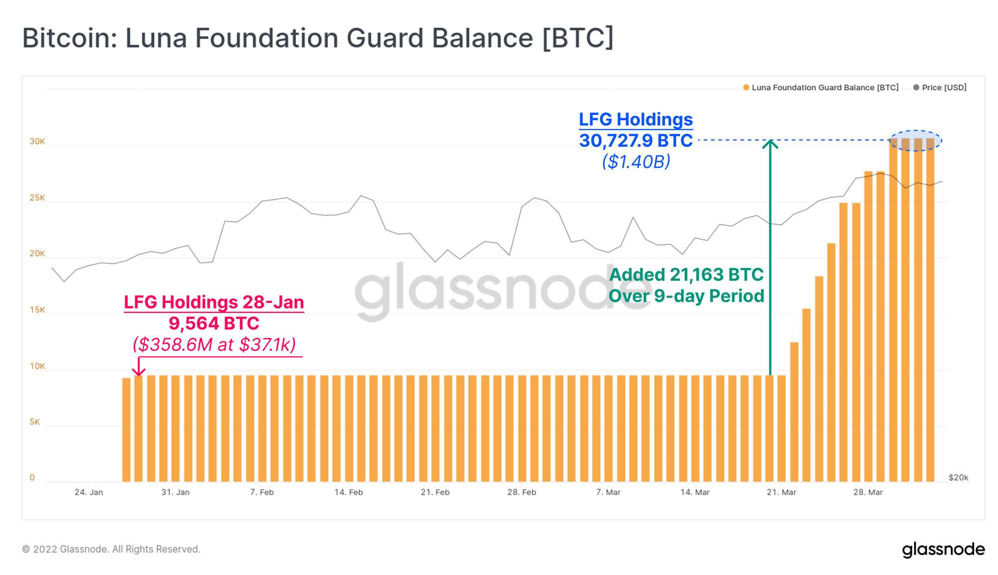 همانطور که گفته شد,در دو هفته اخیر نهنگها(دارای بیش از ۱۰۰۰ بیتکوین) حجم سنگینی از بیتکوین انباشت کردند. یکی از خریداران شناختهشده Luna Foundation Guard (LFG) بود. این مؤسسه در اواخر ژانویه برای بار اول ۹,۵۶۴ بیتکوین به قیمت ۳۵۸.۶ میلیون دلار خریداری کرد و اکنون در طی ۹ روز، ۲۱,۱۶۳ عدد بیتکوین به خزانه خود افزوده است. درمجموع انبوهی از ۳۰.۷۲۷ بیتکوین به قیمت ۱.۴۰ میلیارد دلار نگهداری میکند.