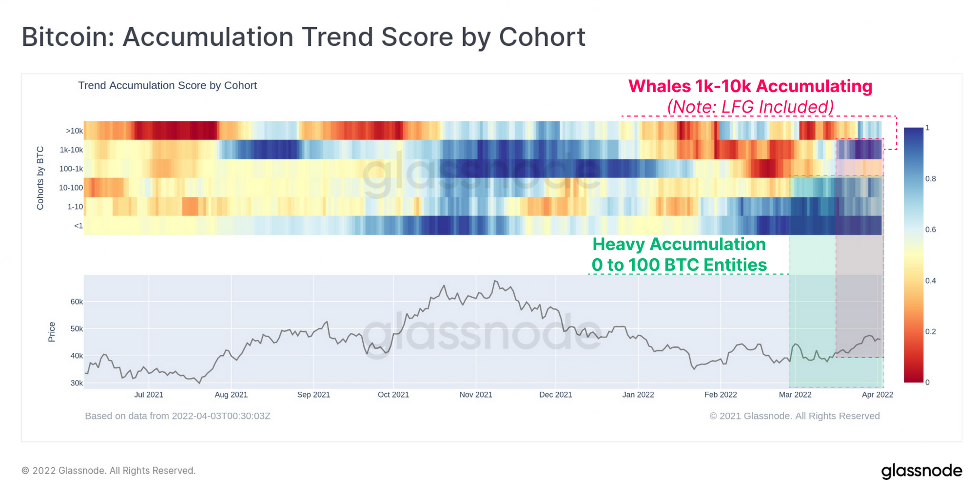 همینطور واضح است که کیف پولهایی که بین ۱۰۰ تا ۱۰۰۰ بیتکوین دارند، کمترین میزان انباشت را داشتند(ناحیه قرمز). در همین حال طی دو هفته اخیر، گروهی که بیشتر از هزار بیتکوین داشتند با جدیت تمام شروع به انباشت کردند. دسته آدرسهایی مانند LFG هم در همین گروه قرار دارد که در قسمت بعدی به آن می پردازیم.