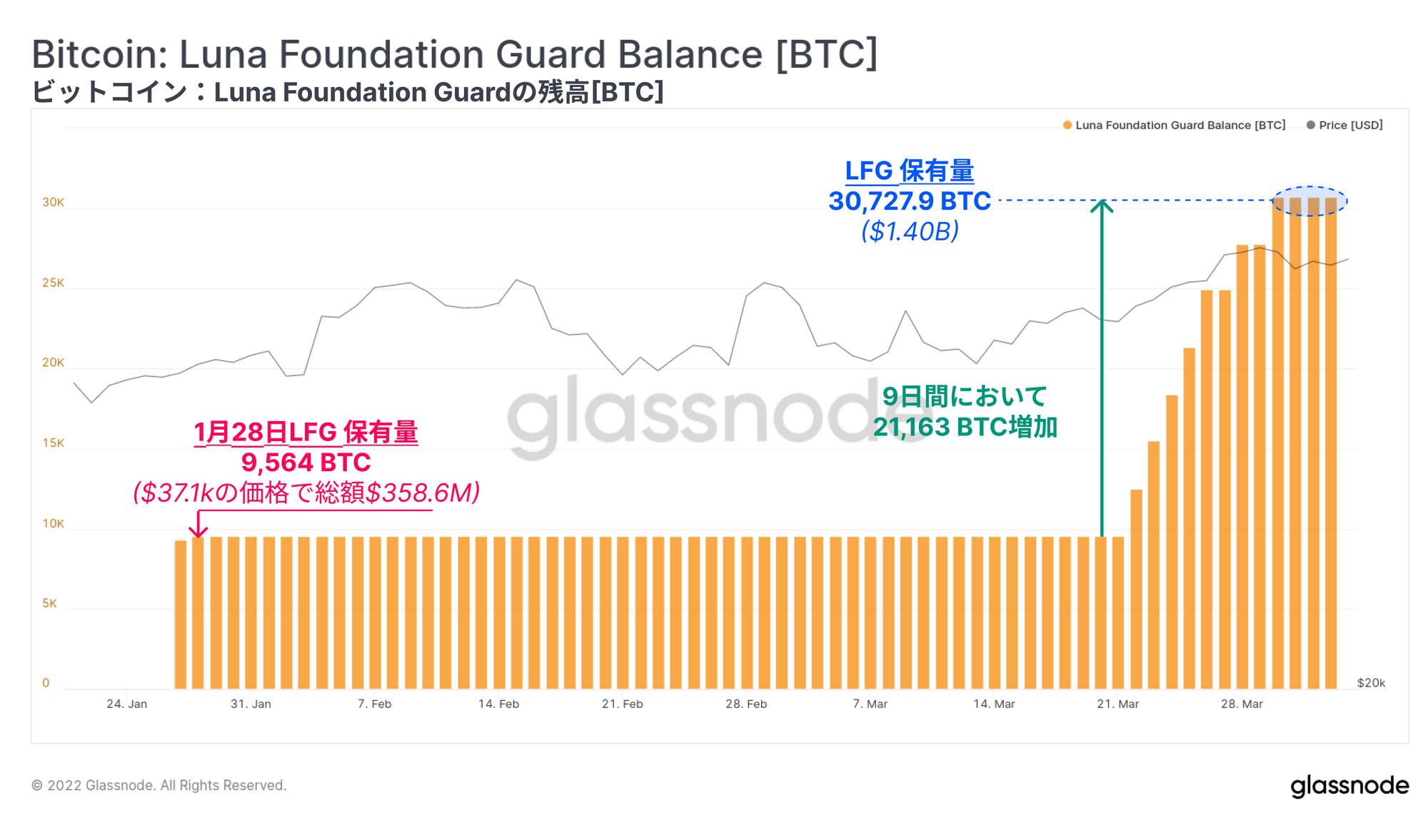 ここ2週間で、クジラ(保有残高が1k BTC以上)のエンティティによって非常に大量のBTCが蓄積されていることが確認された。最も公開されているエンティティの1つはLuna Foundation Guard (LFG)で、現在30,727BTCを蓄積している。1月下旬に当時の価値、$358.6Mで9,564BTCを購入し、LFGの残高は9日間で21,163BTCも増えた。LFG残高の総額は現在$1.40 Billionを超えている。