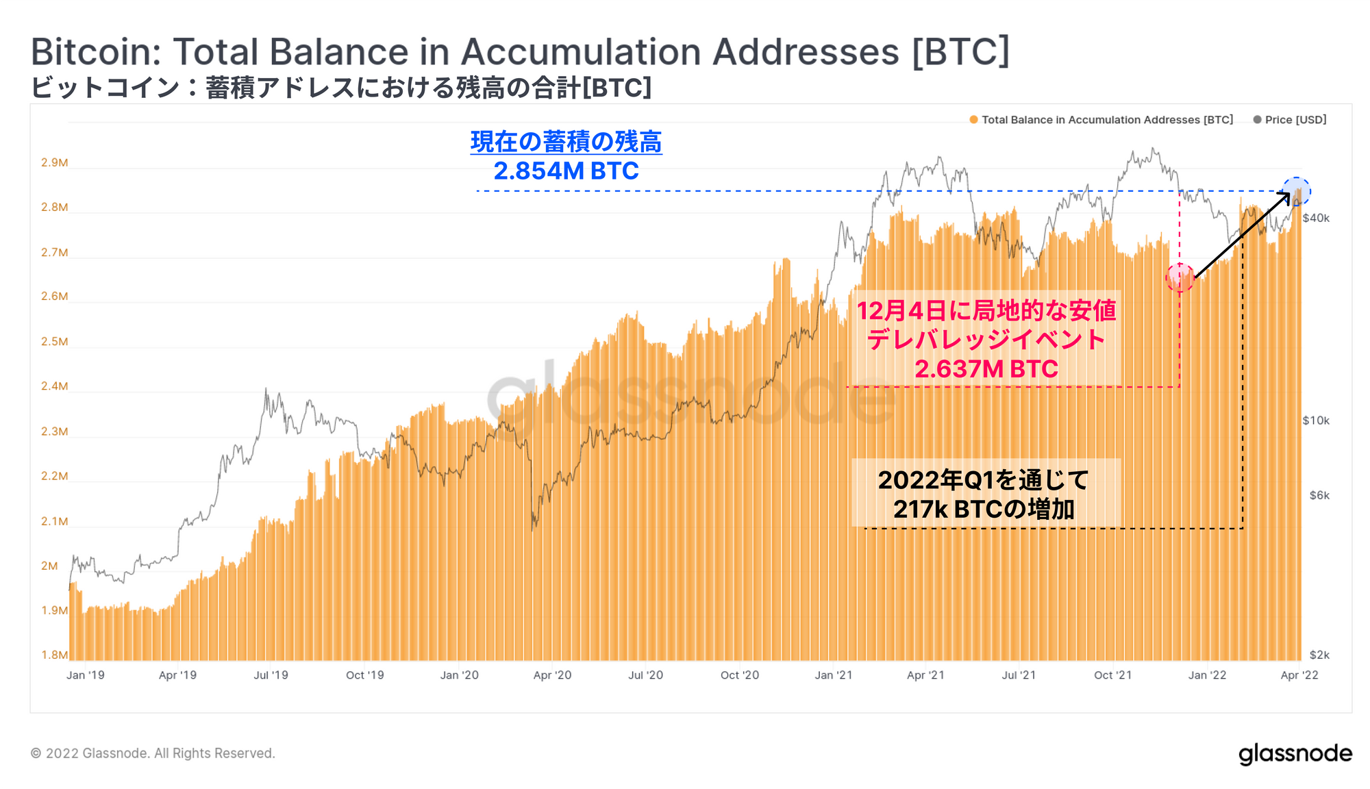 蓄積アドレスに保有されている総残高は、12月4日の市場のデレバレッジイベント以降に計測した過去4ヶ月間で217k BTC増加している。これは、1,800BTC/日の増加に相当し、マイナーへの1日の発行量の2倍に相当する。これはまた、2021年の大部分を通じて確立された横ばいトレンドから脱却していることに留意してほしい。