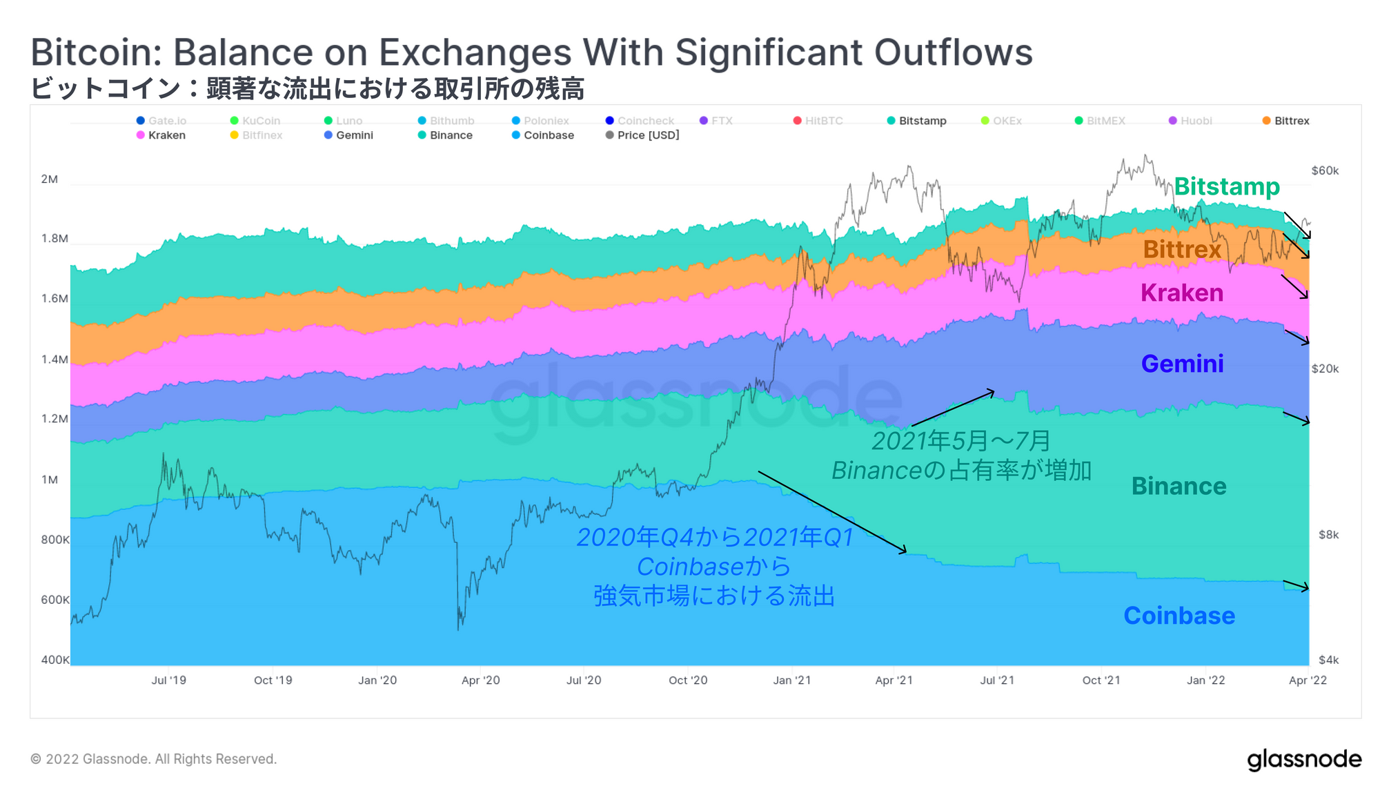 特定の取引所について詳しく見てみると、流出の大部分は業界最大手の取引所から発生していることがわかる。Coinbase、Binance、Gemini、Kraken、Bittrex、Bitstampなどの多くは過去12~24ヶ月の間に純残高が増加したにもかかわらず、最近は著しい純流出が見られている。特にBinanceは、2021年にコイン残高の占有率は爆発的に高くなっていたが、過去2週間で20.8k BTC以上の流出があった。