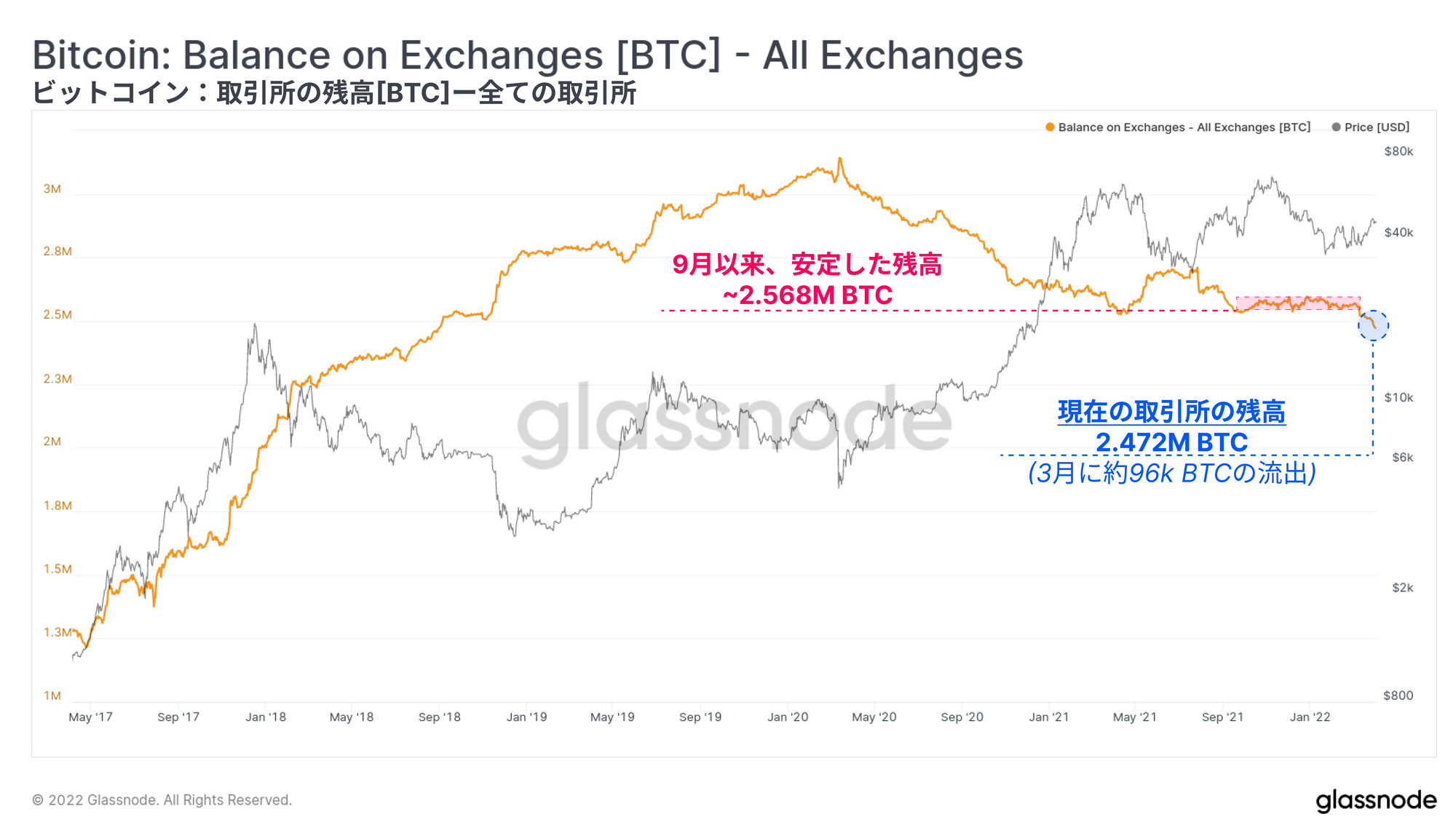 このような持続的かつ高水準のBTC流出の影響により、取引所での保有残高の合計は数年来の低水準になっている。3月の間に、我々が追跡している取引所から96k BTC以上が流出し、2018年8月の流出レベルに達している。これは、2021年9月から確立された取引所残高における横ばいの安定期から急激な下降を意味することに留意してほしい。