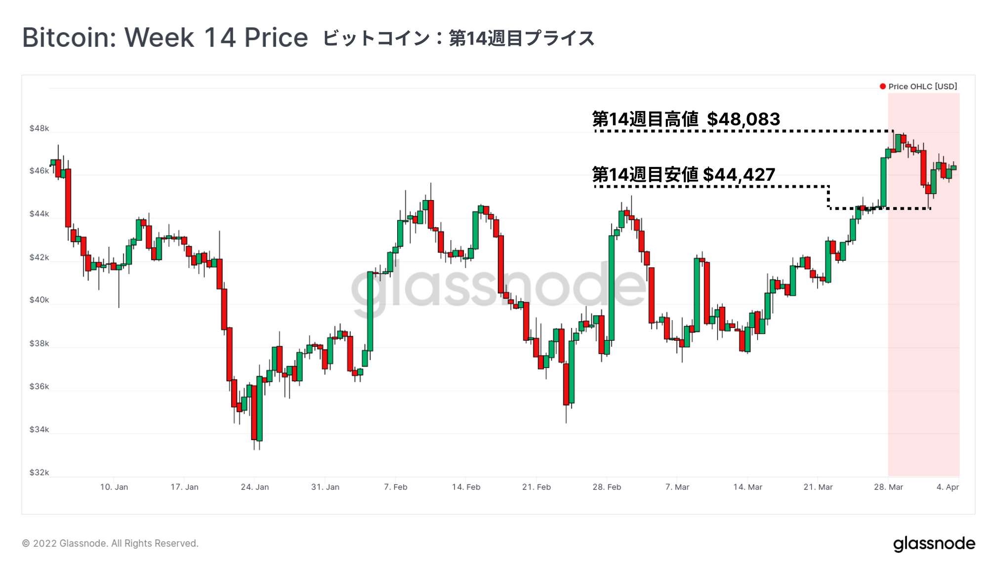 今週の市場は、安値44,427ドルから高値48,083ドルの間でのレンジ内で取引されており、最近の価格上昇後に高止まりしている。