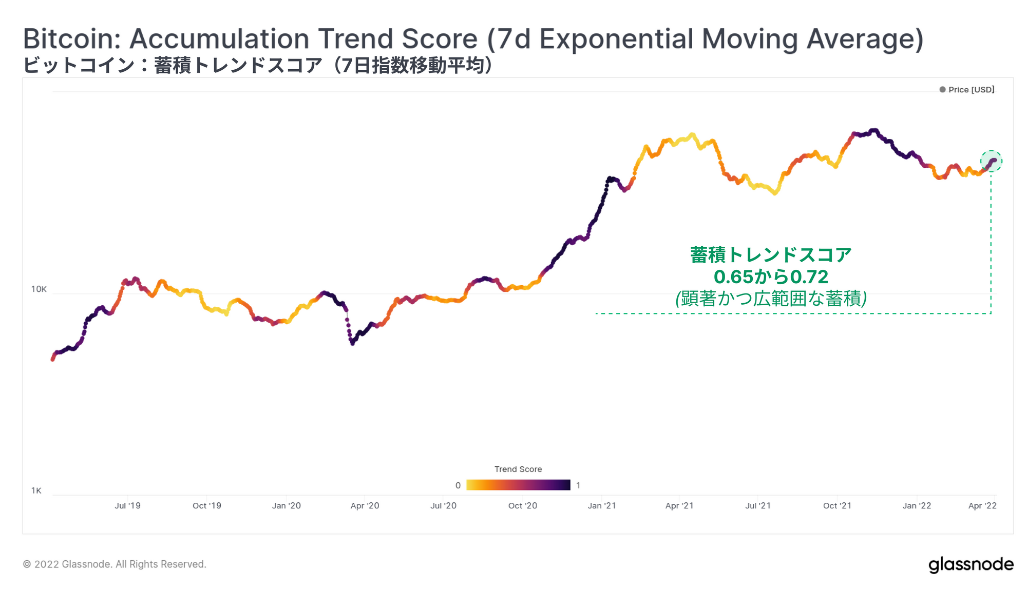 蓄積トレンドスコアは、市場全体の相対的なオンチェーン残高の変化を追跡するためにリリースされた最新のツールの1つである。1(紫色)に近い値は、クジラおよび、または市場エンティティの大多数の残高が大幅に増加していることを示す。今週は、一般的に蓄積傾向が進行中であることを示す0.65より上の値が一貫して提示され続けた。
