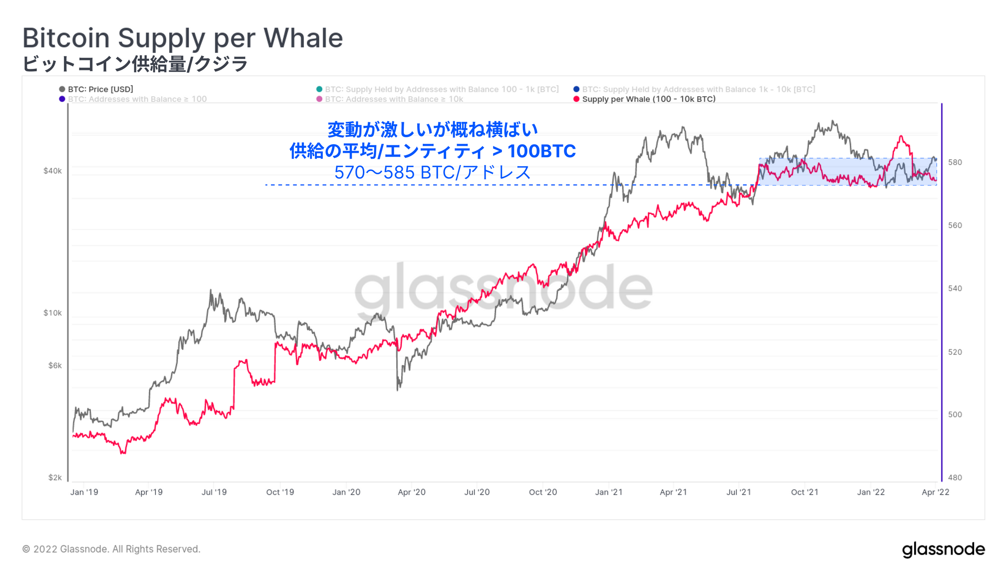 次に、100~10kBTCを保有する大規模なビットコイン保有者(サメからクジラ)に関連するアドレスで保有されている平均供給量に注目する。2021年8月以降、このコホートによる各アドレスでの平均保有BTC量は、1アドレスあたり570~585BTCの間で均衡した状態となっている。保有する供給量と、このコホートにおけるアドレス数のいずれもが、この間では非常に安定している。このコホートが現在の蓄積傾向には最も寄与していないことを示している。
