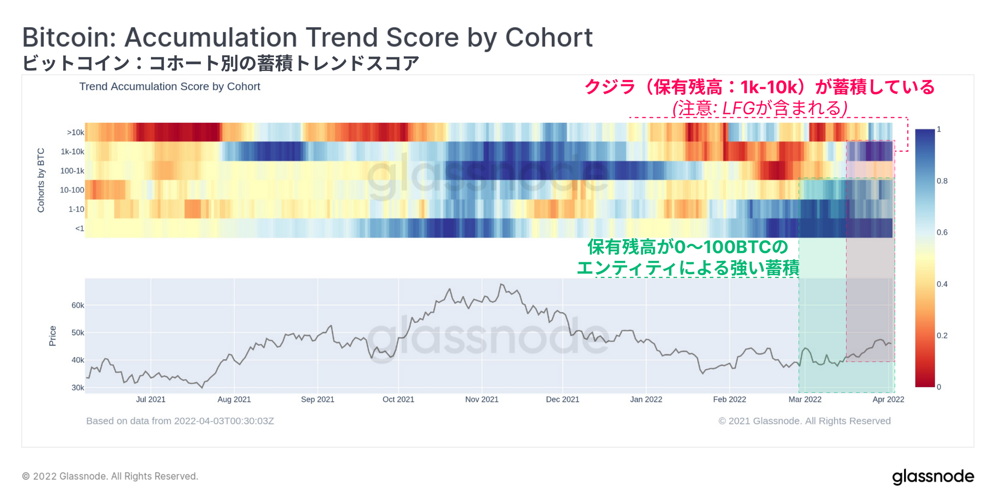 また、残高が100-1k BTCのコホートは全体の蓄積に最も貢献していない(赤色のゾーン)一方で、クジラコホート(保有残高>1k BTC)は過去2週間で著しい蓄積を開始したことがわかる。これには、次のセクションで詳しく説明するLFGのようなエンティティが含まれる。