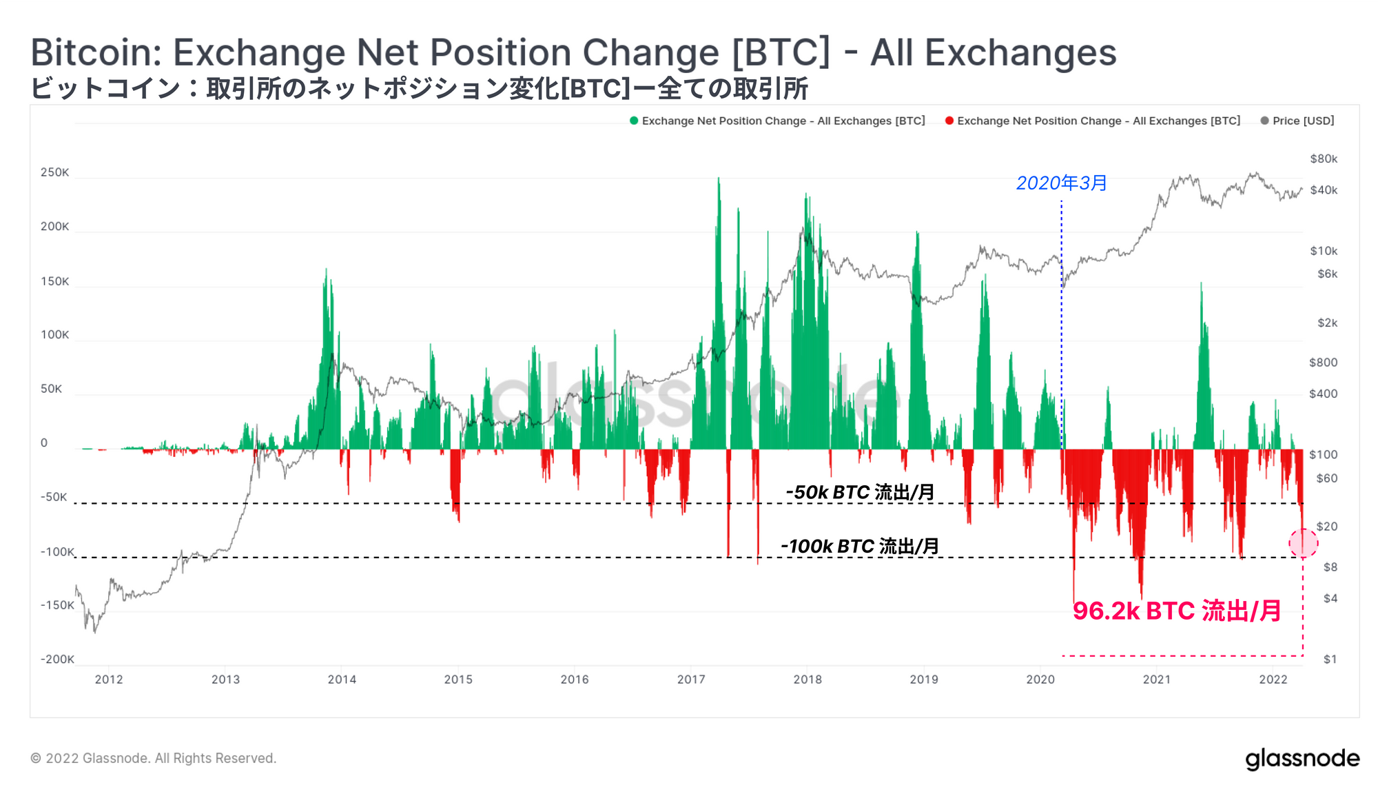 これを受けて、取引所残高は歴史的に著しいBTCの流出期となり、96.2k BTC/月の流出に達していることが分かる。このような規模の流出は珍しく、歴史的に見ても数回しか起きていない。
