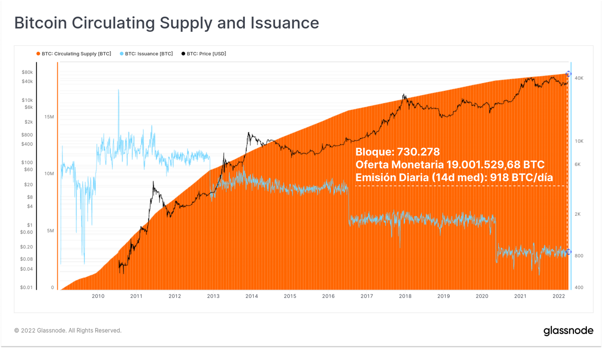 Esta semana la oferta total de Bitcoin ha alcanzado las 19 millones de monedas ya minadas, dejando para minarse apenas algo menos del 9.52% de esa oferta final de 21 millones para los próximos ~118 años. En estos momentos (bloque número 730.278), la oferta total de BTC en circulación es de 19.001.529,68 BTC, y tenemos una emisión diaria de 918 BTC/día (en base a la mediana de 14 días).