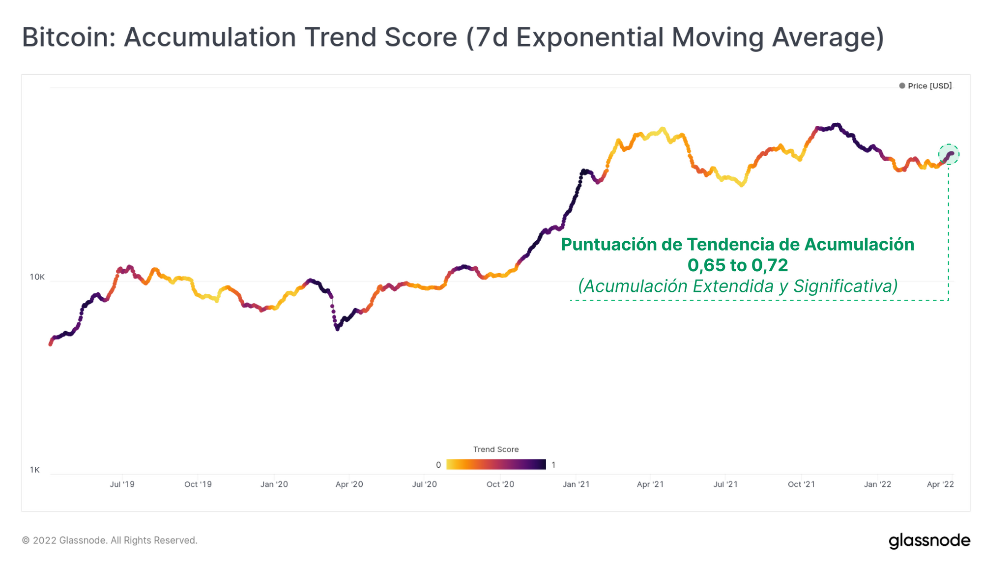 La Puntuación de Tendencia de Acumulación es una de nuestras herramientas publicadas más recientemente para monitorizar a grandes rasgos el cambio relativo de balances en el mercado del blockchain. Unos valores cercanos a 1 (púrpura) nos indican que hay ballenas y/o una gran proporción de las entidades del mercado aumentan significativamente el tamaño de sus arcas. Esta semana se han impreso una serie de valores que se han mantenido por encima del 0.65 de manera consistente, señalando que hay en marcha una tendencia general de acumulación.